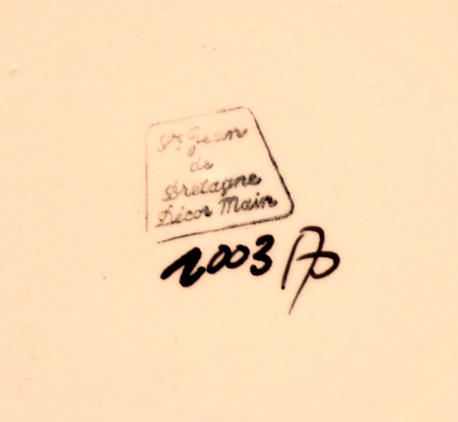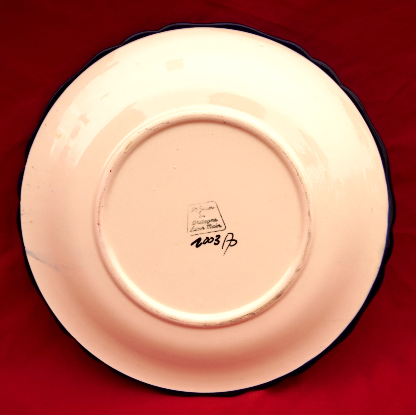 Vintage french hand painted faience geometric blue and white decor plate made by St Jean de Bretagne near Quimper during the 1960's. It's signed on the back. 10" (25.5cm) diameter. Perfect condition  as shown by the following pictures.