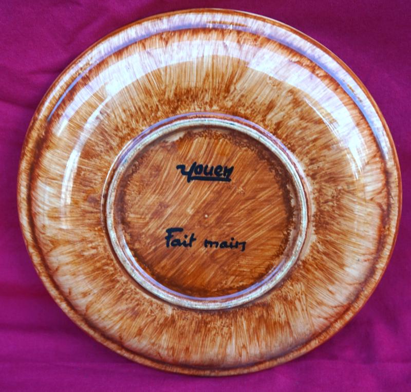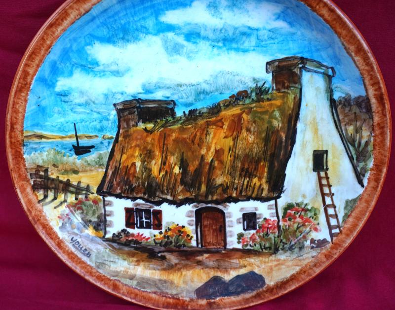French hand painted faience decorative plate showing breton thatched cottage, sea and sailing baot made by Youen Quimper in 1960's. It's signed in front and on the back. 9 5/8" (24.5cm) diameter. Perfect condition.