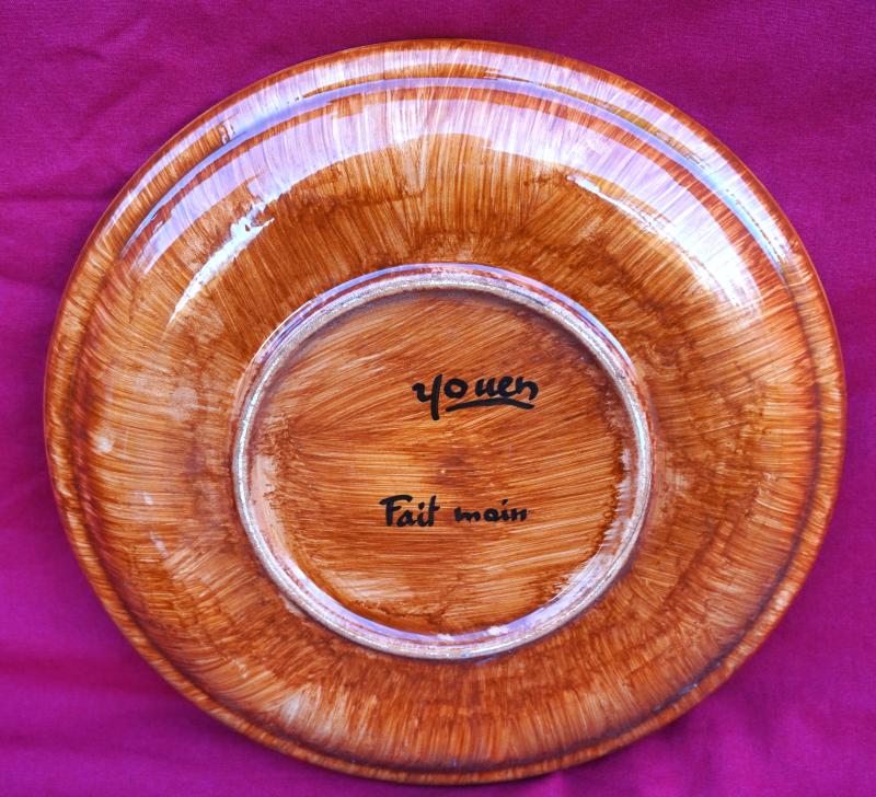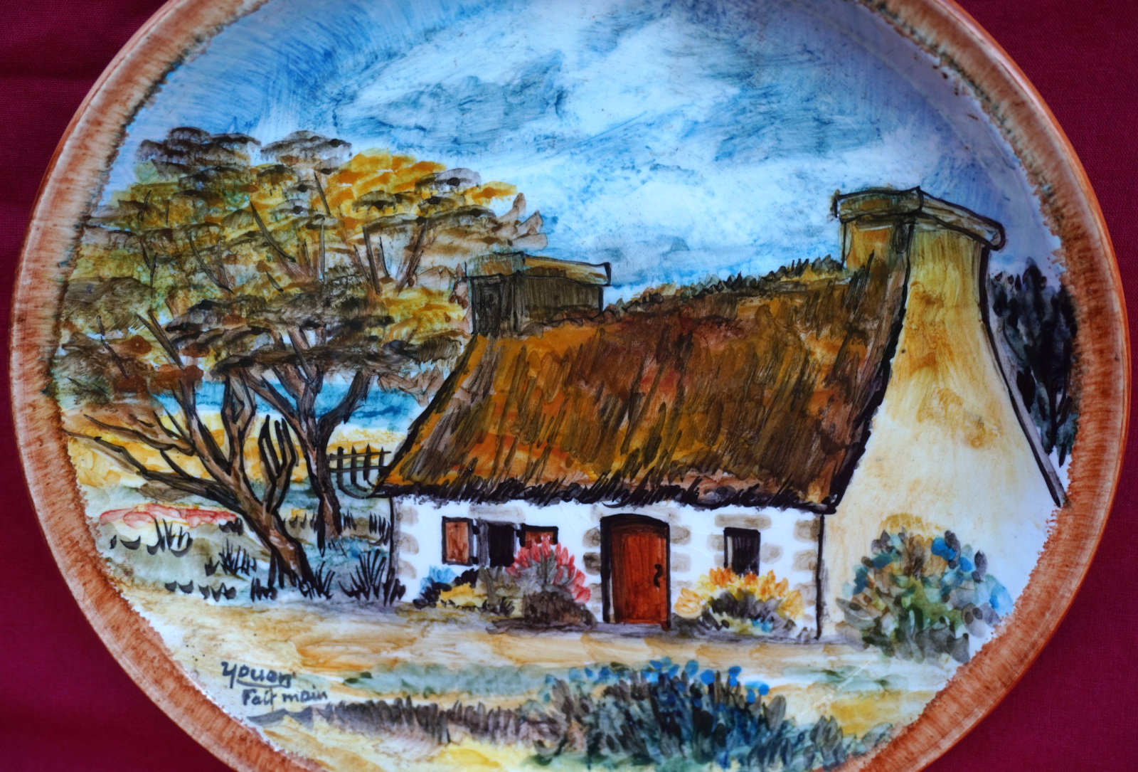 French hand painted faience decorative plate showing breton thatched cottage made by Youen Quimper in 1960's. It's signed in front and on the back. 9 5/8" (24.5cm) diameter. Perfect condition.