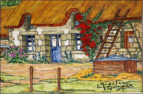 Vintage Breton cottage , hand painted faience tile framed made by L Medelec in quimper. It's signed in the bottom right vorner. 11" (28,2cm) by side for the frame, 7 1/4" (18.3cm) by side for the tile. Perfect condition