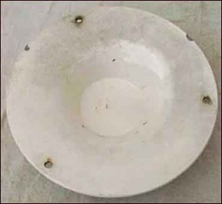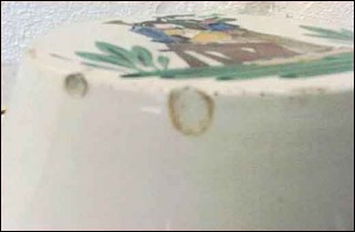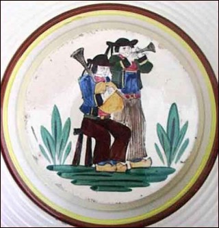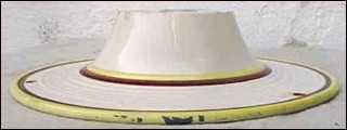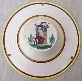 Rare ceiling flower holder made in the Quimper factory abut 1935. Hat shaped it is hand painting with breton bagpipes musicians in traditionnal costums. Good condition only 3 small chips as you can see on the pictures below and the chains are missing. 11"3/4 diameter 2"3/4 tall.