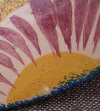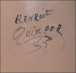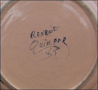 Decorative plate in french faience showing hand painted dahlias with corbeille pattern on a rose background made by the famous Henriot studio in Quimper during the 1930's. It's signed on the back Henriot Quimper. Good condition a few original glaze shortages and tears grinded as you can see on the pictures below. 9 1/2" diameter.