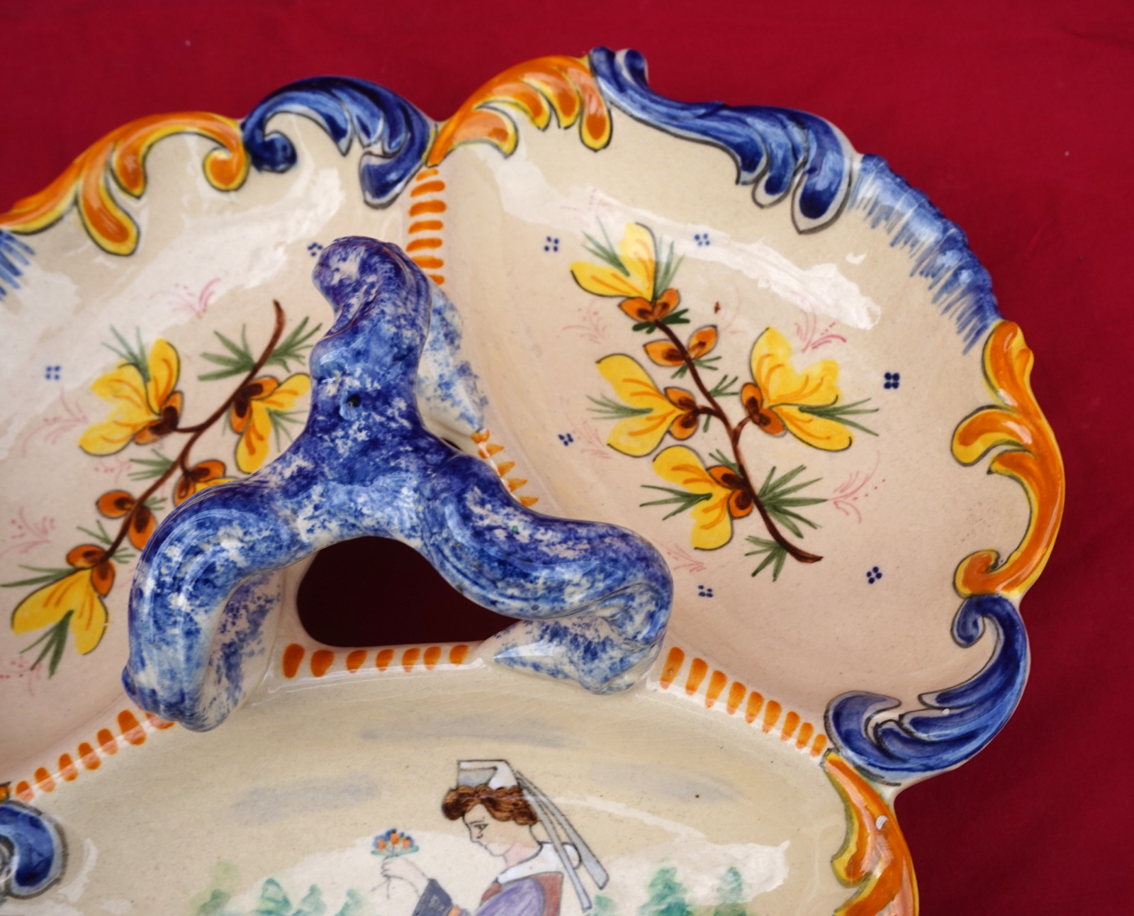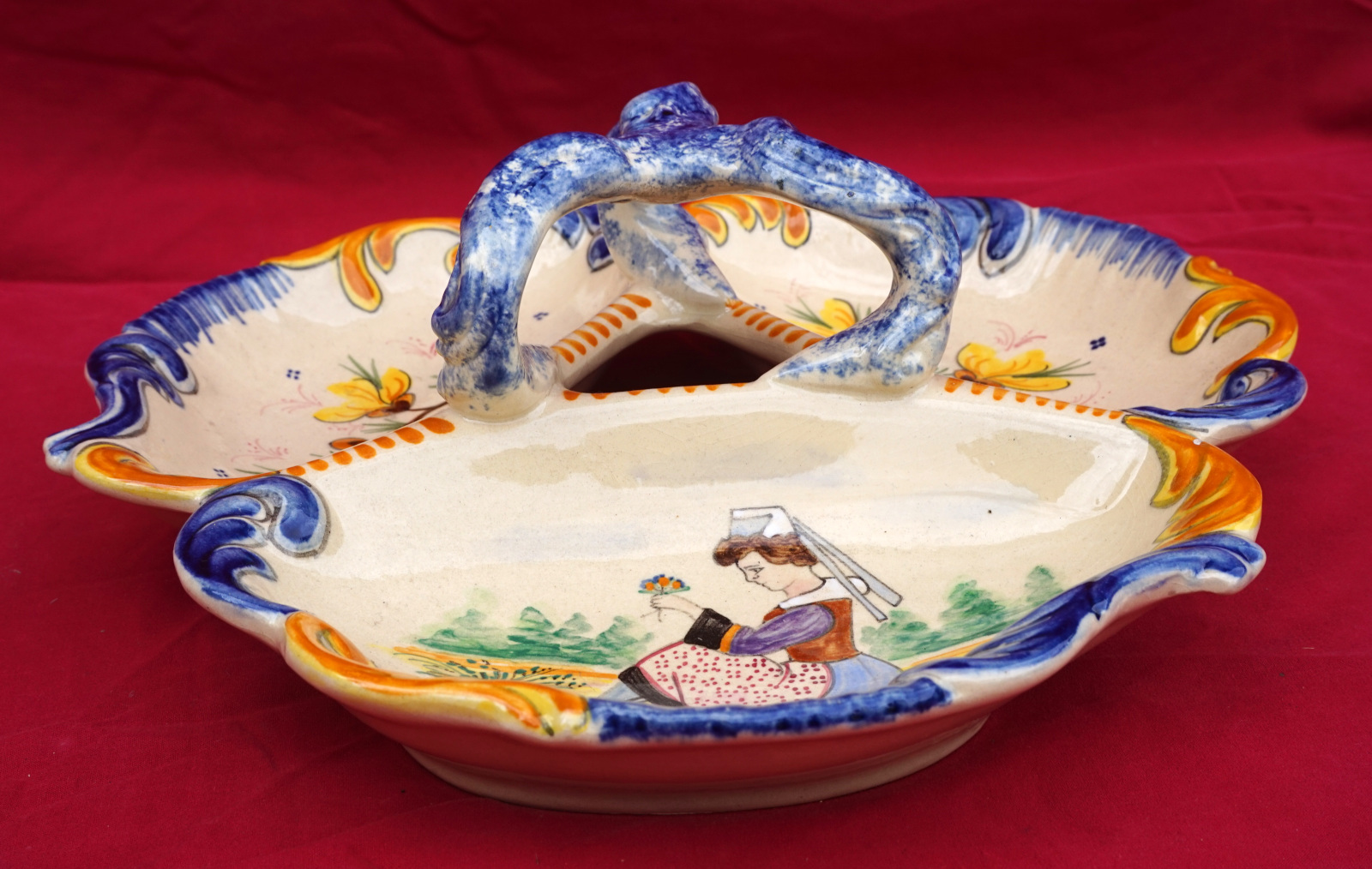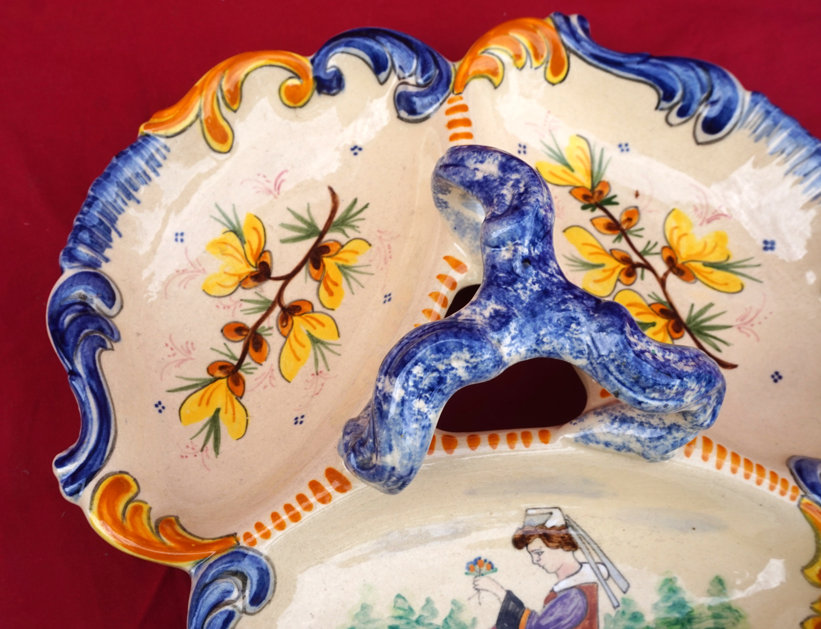 French hand painted faience trilobed hors d'oeuvre serving dish showing little bretonne and flowers with handle made by HB Quimper during the 1950's. It's signed on the back. 11" (28cm) diameter, 7 1/2" (9cm) height. Perfect condition