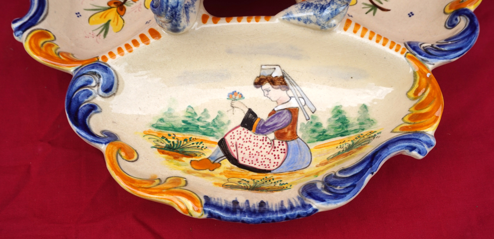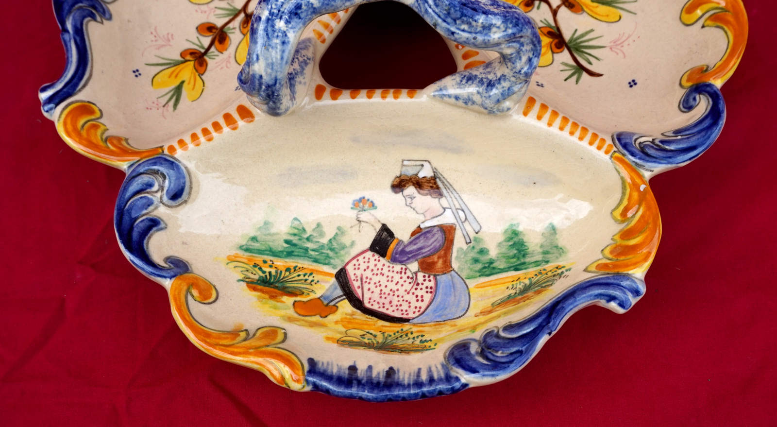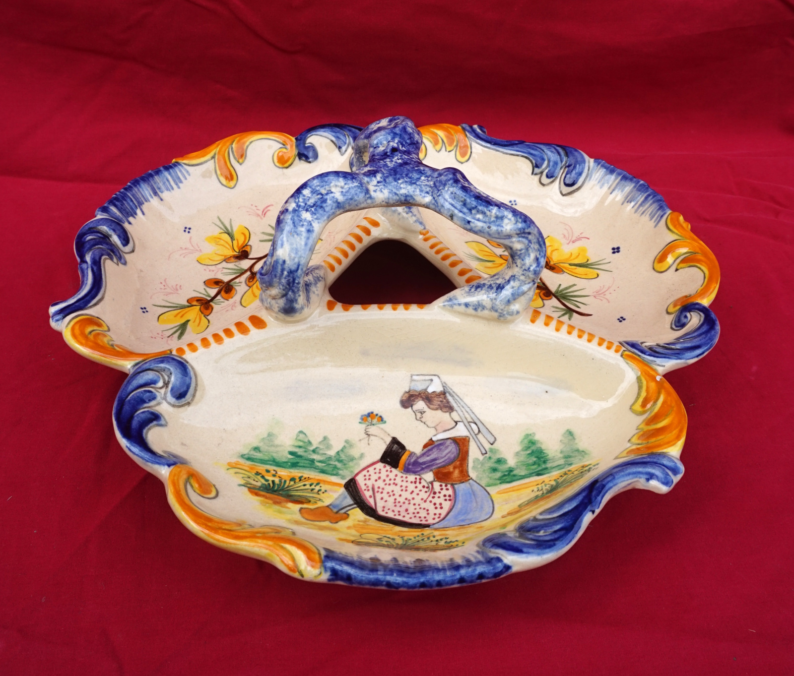 French hand painted faience trilobed hors d'oeuvre serving dish showing little bretonne and flowers with handle made by HB Quimper during the 1950's. It's signed on the back. 11" (28cm) diameter, 7 1/2" (9cm) height. Perfect condition