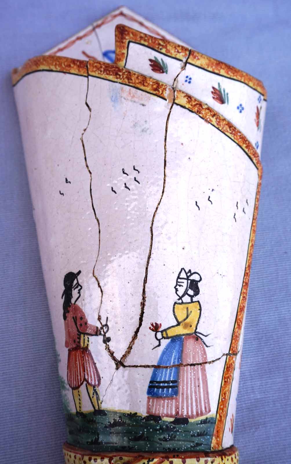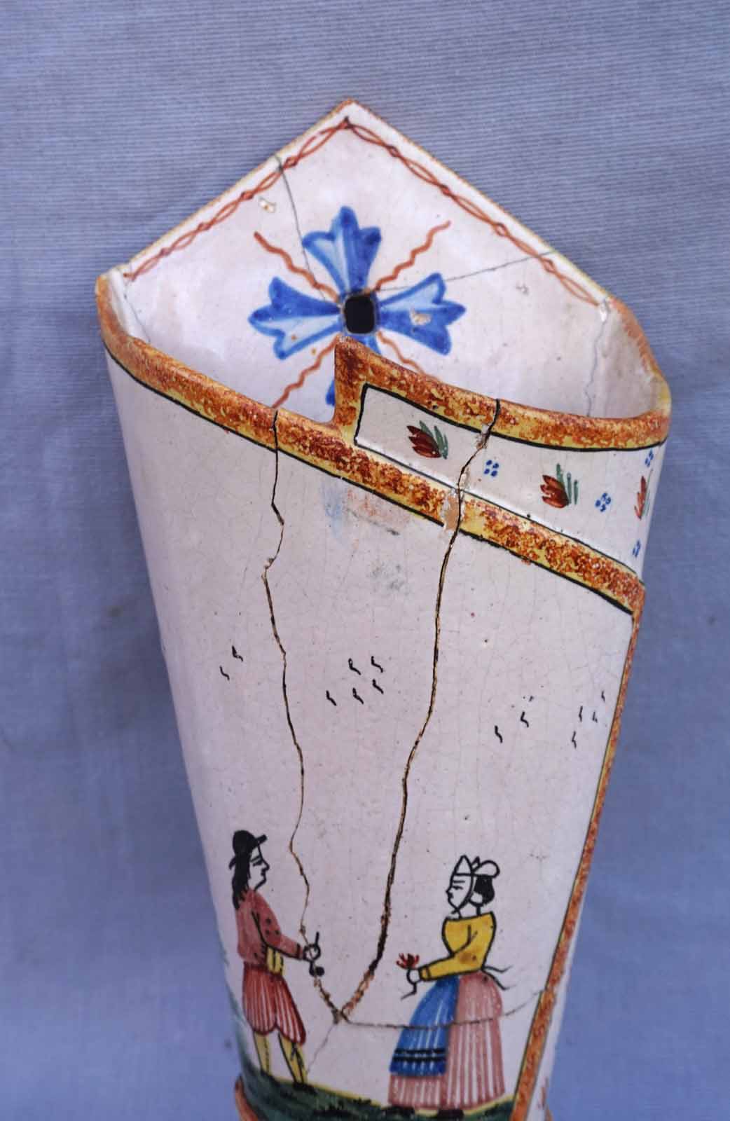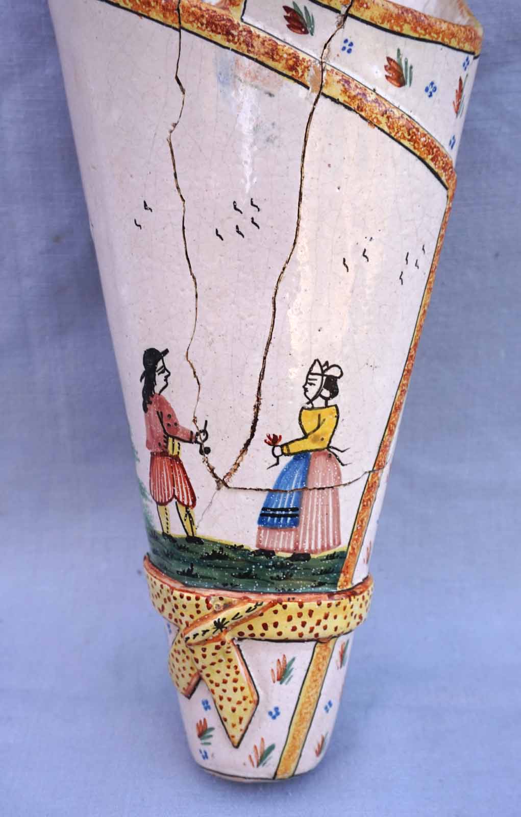 Cornet vase mural en faience peinte à la main d'un couple de Breton HB Quimper vers 1910. Hauteur 32.2cm, largeur 14cm, profondeur 9cm. Cassures et réparations.