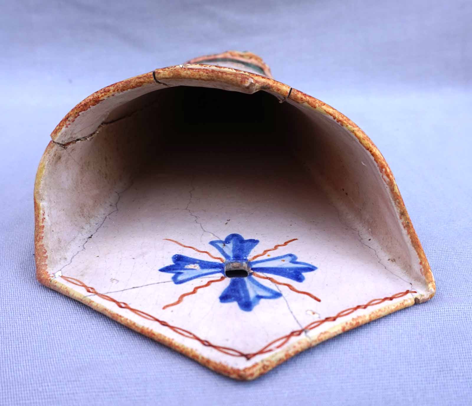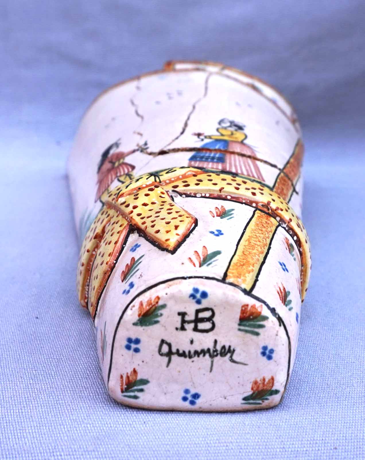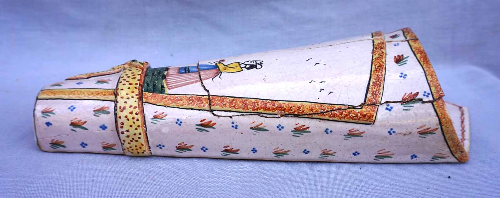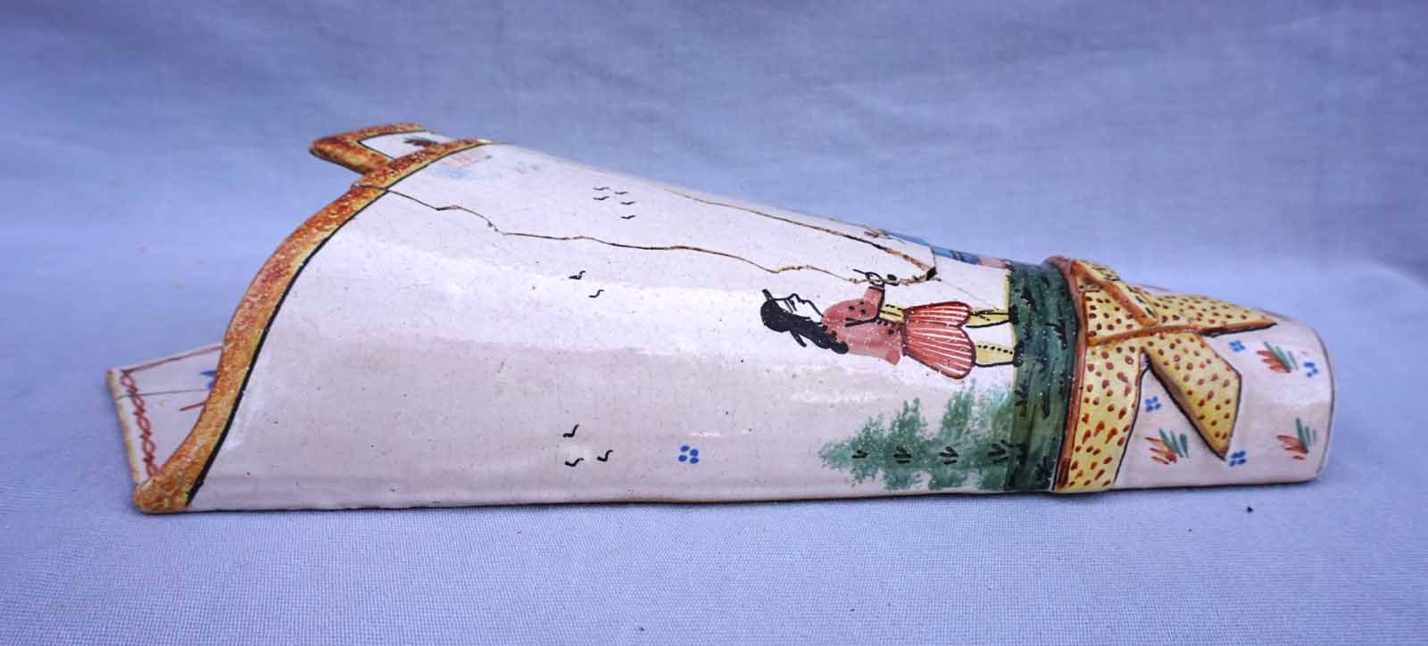 Cornet vase mural en faience peinte à la main d'un couple de Breton HB Quimper vers 1910. Hauteur 32.2cm, largeur 14cm, profondeur 9cm. Cassures et réparations.