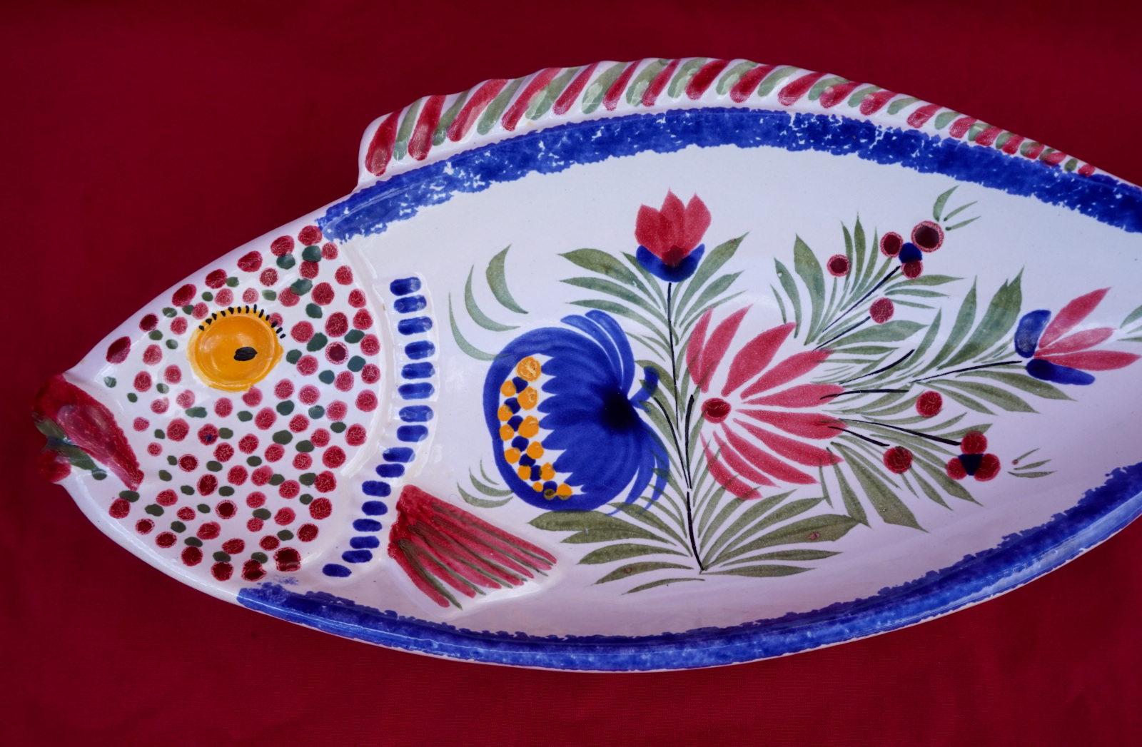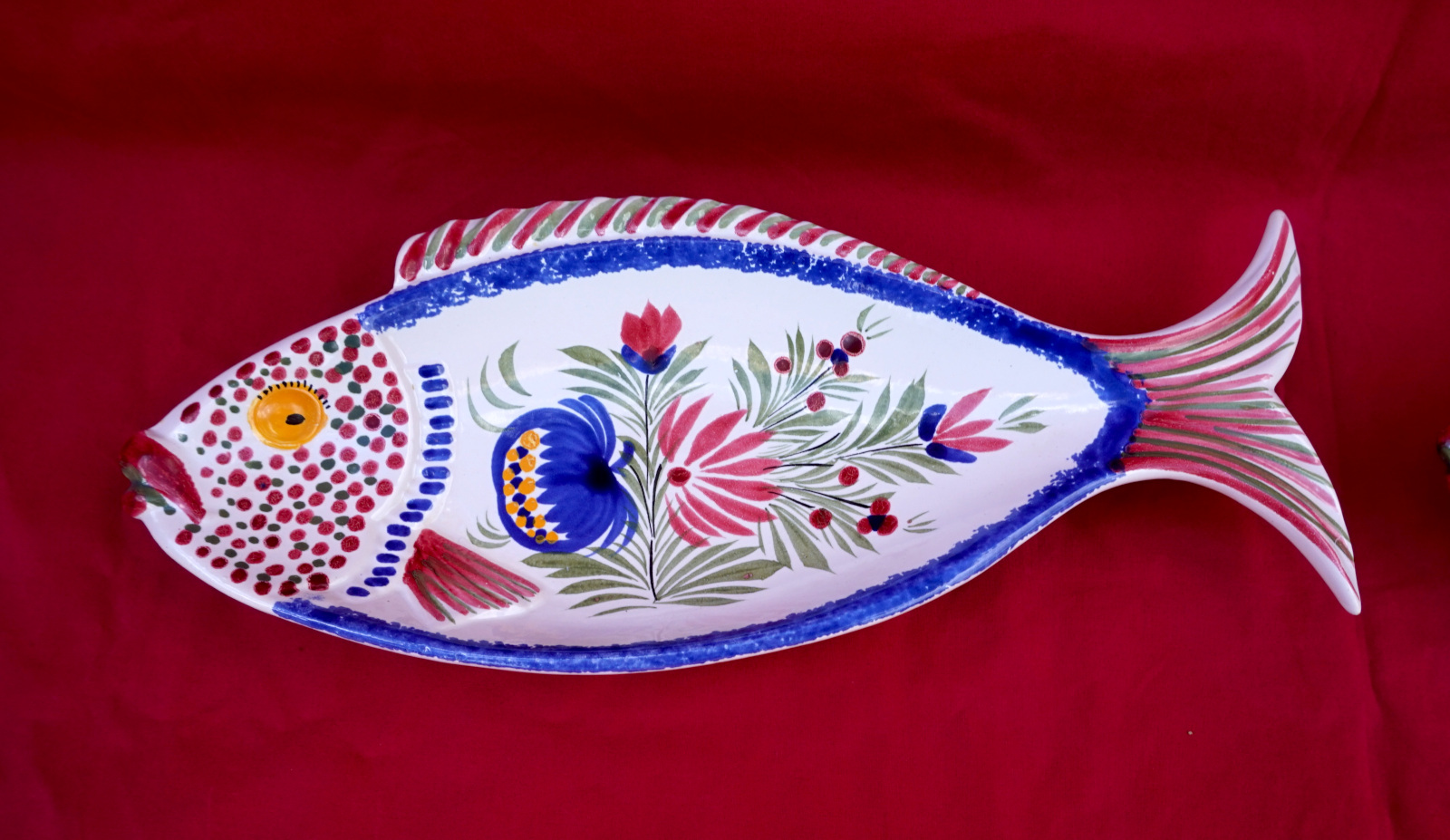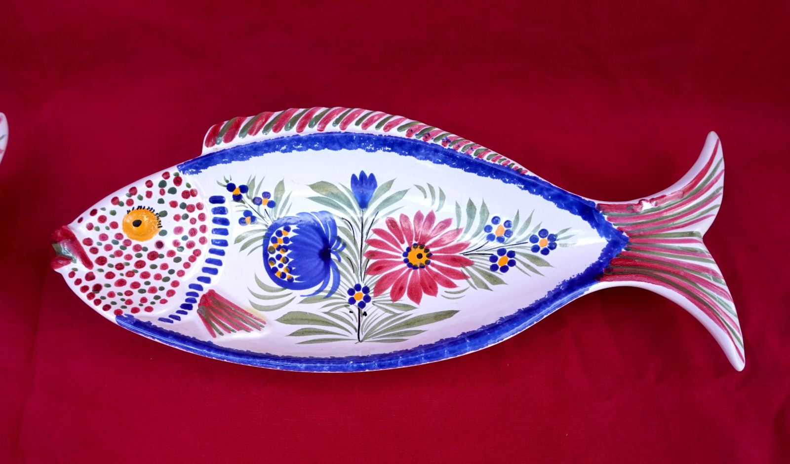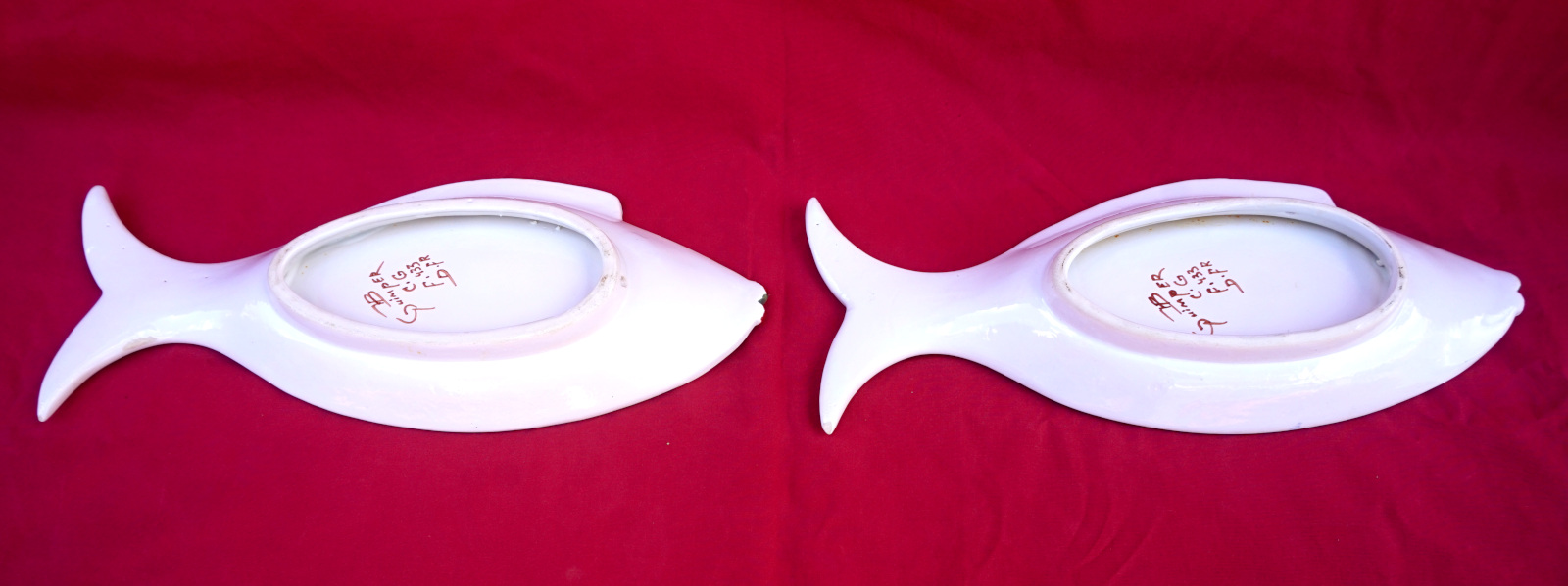 Vintage  french hand painted faience pair of fish shaped small dishes made by HB Quimper during the 1980's. They are signed on the back. 11 3/4" (29.7cm) length, 4 3/4" (12cm) width. Perfect condition.