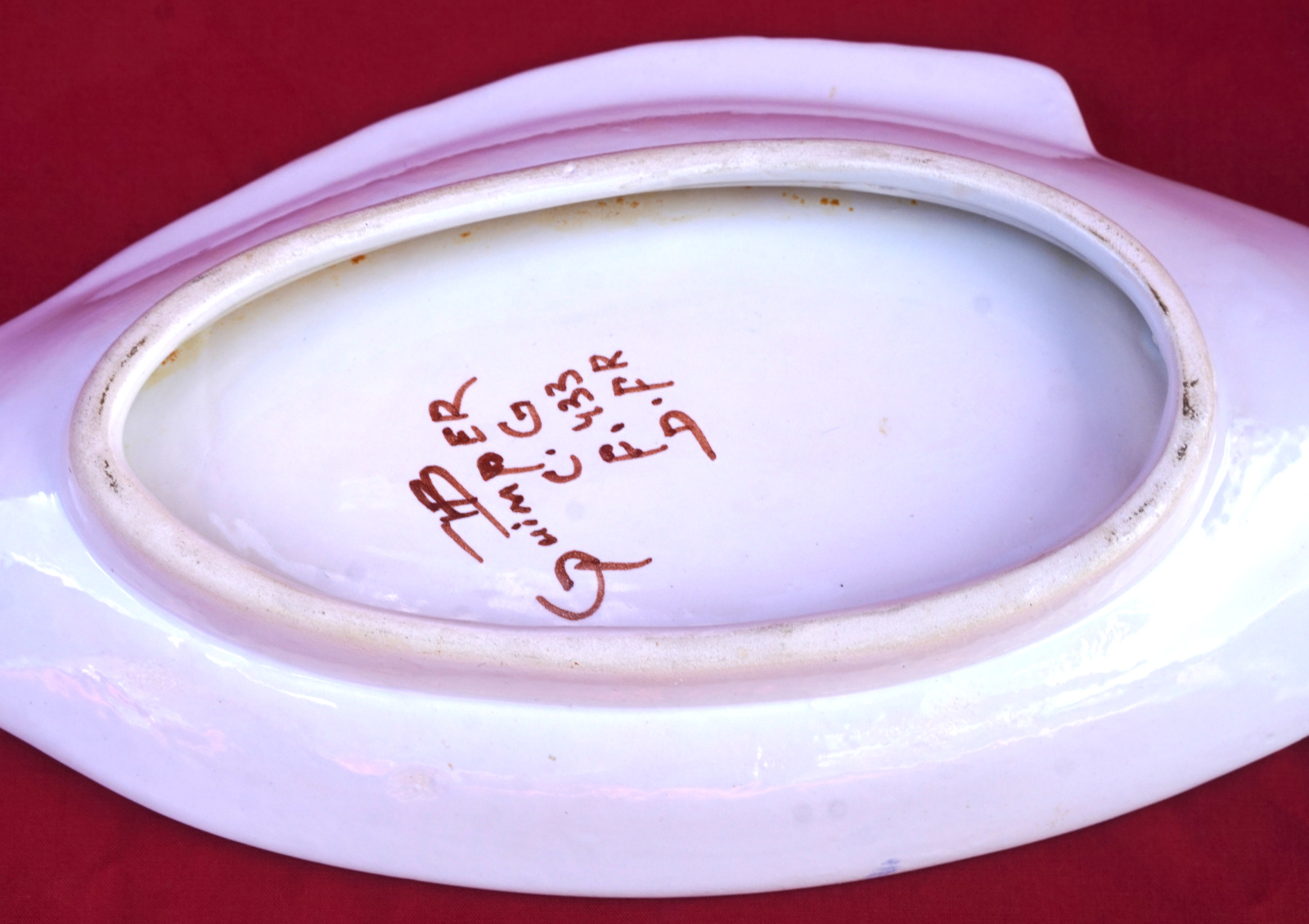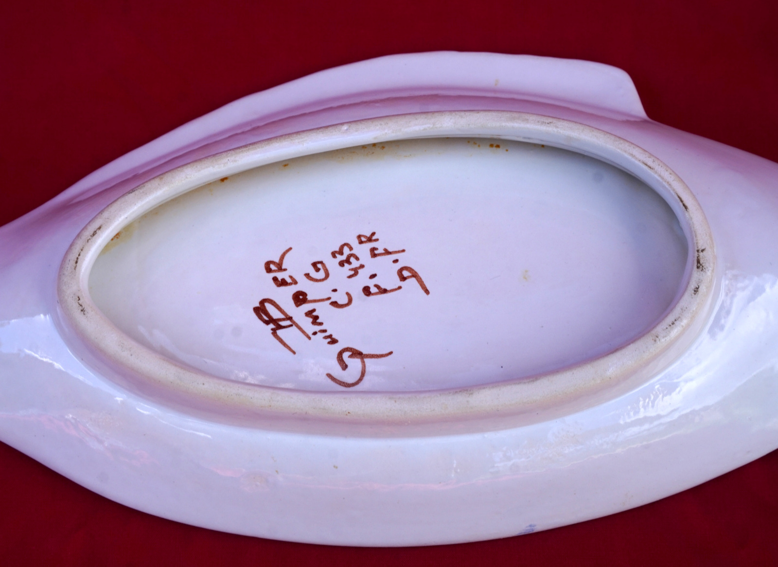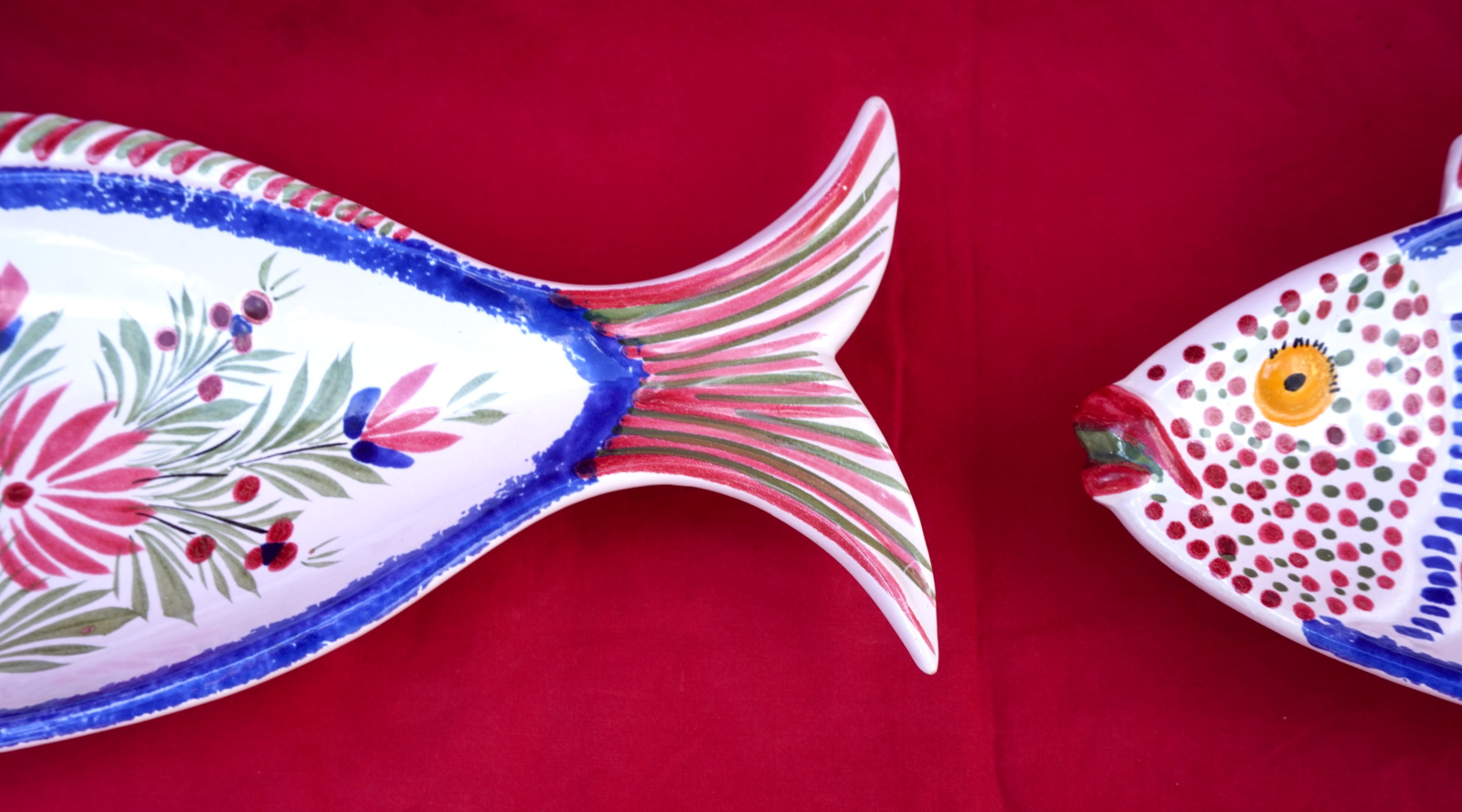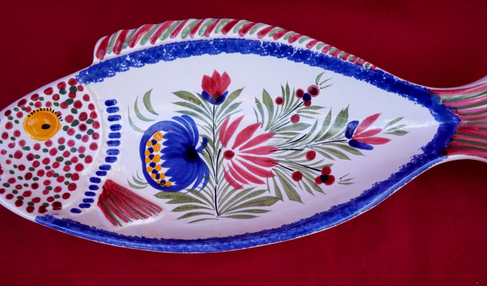 Vintage  french hand painted faience pair of fish shaped small dishes made by HB Quimper during the 1980's. They are signed on the back. 11 3/4" (29.7cm) length, 4 3/4" (12cm) width. Perfect condition.
