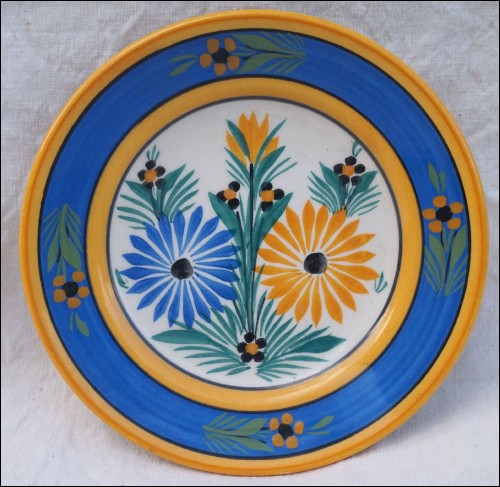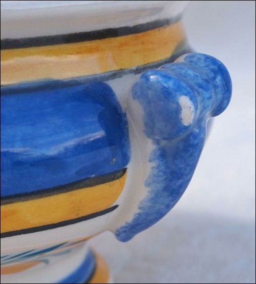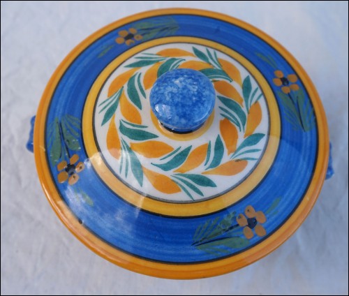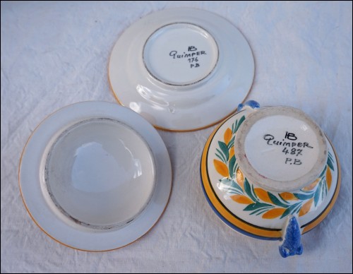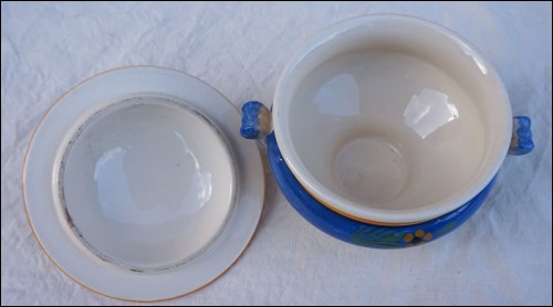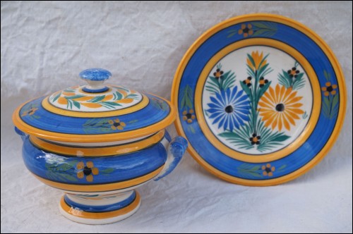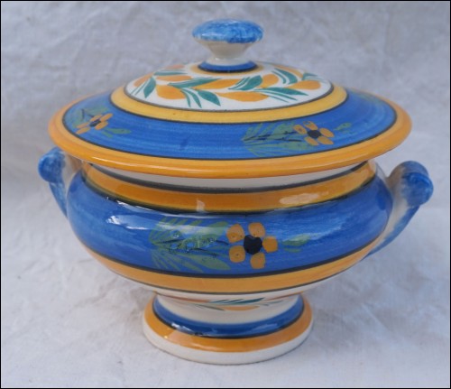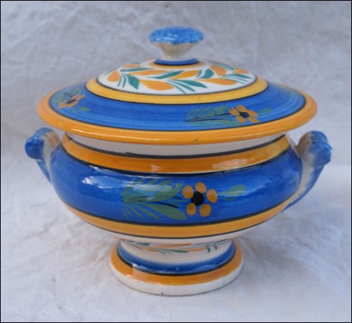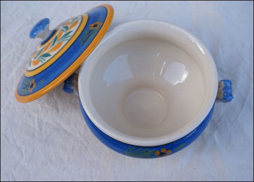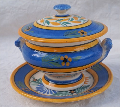 Vintage flowered lidded sauce tureen or casserole with saucer showing blue and yellow flower made HB in Quimper during the 1950's. They are signed on the back. 6 1/4" diameter for the saucer plate, 4 1/2" diameter for the tureen 5 3/4" width with the handles and 4 1/8" height. Good condition only a glaze shortage on the handle and a tiny chip on the lid as presented on the following pictures.