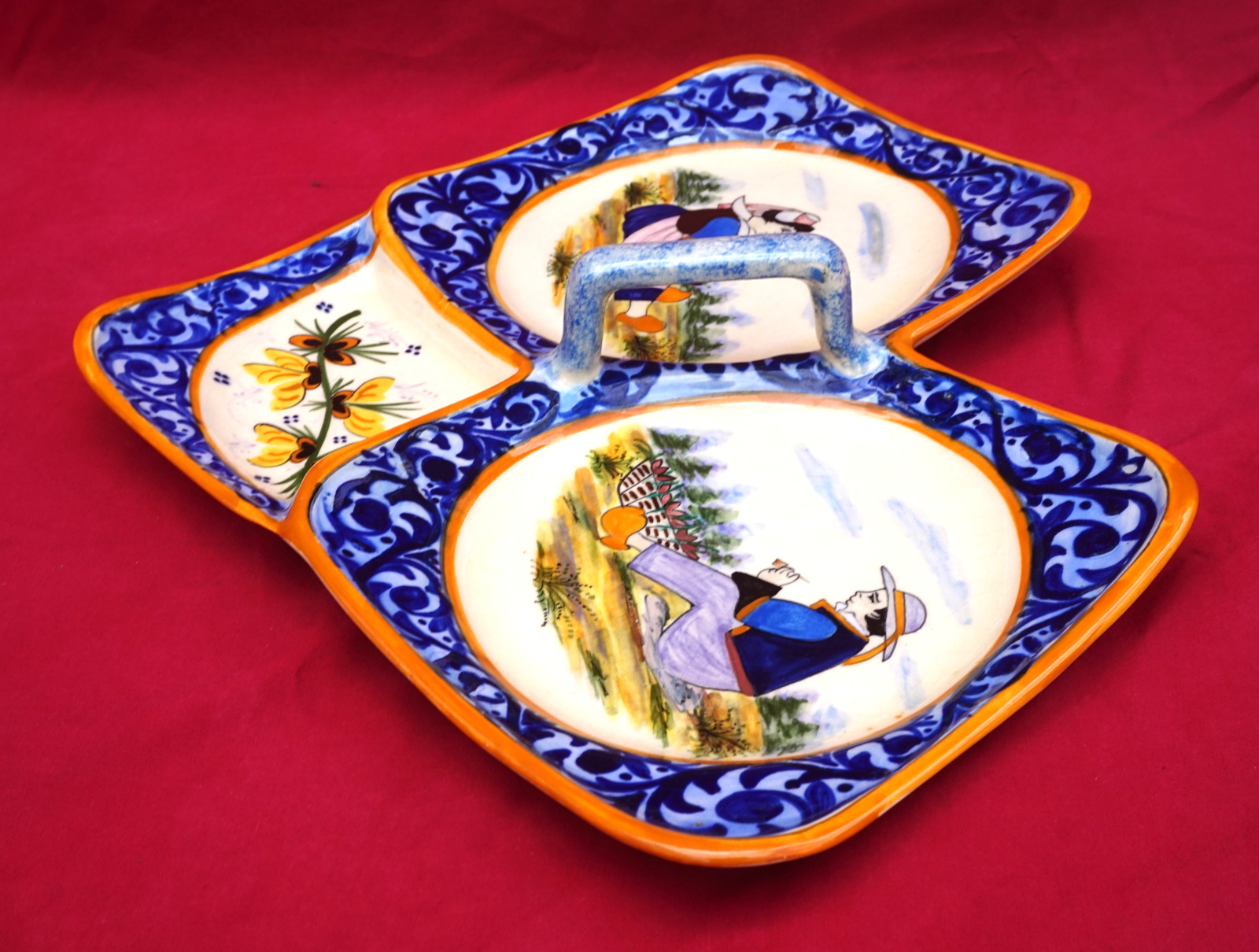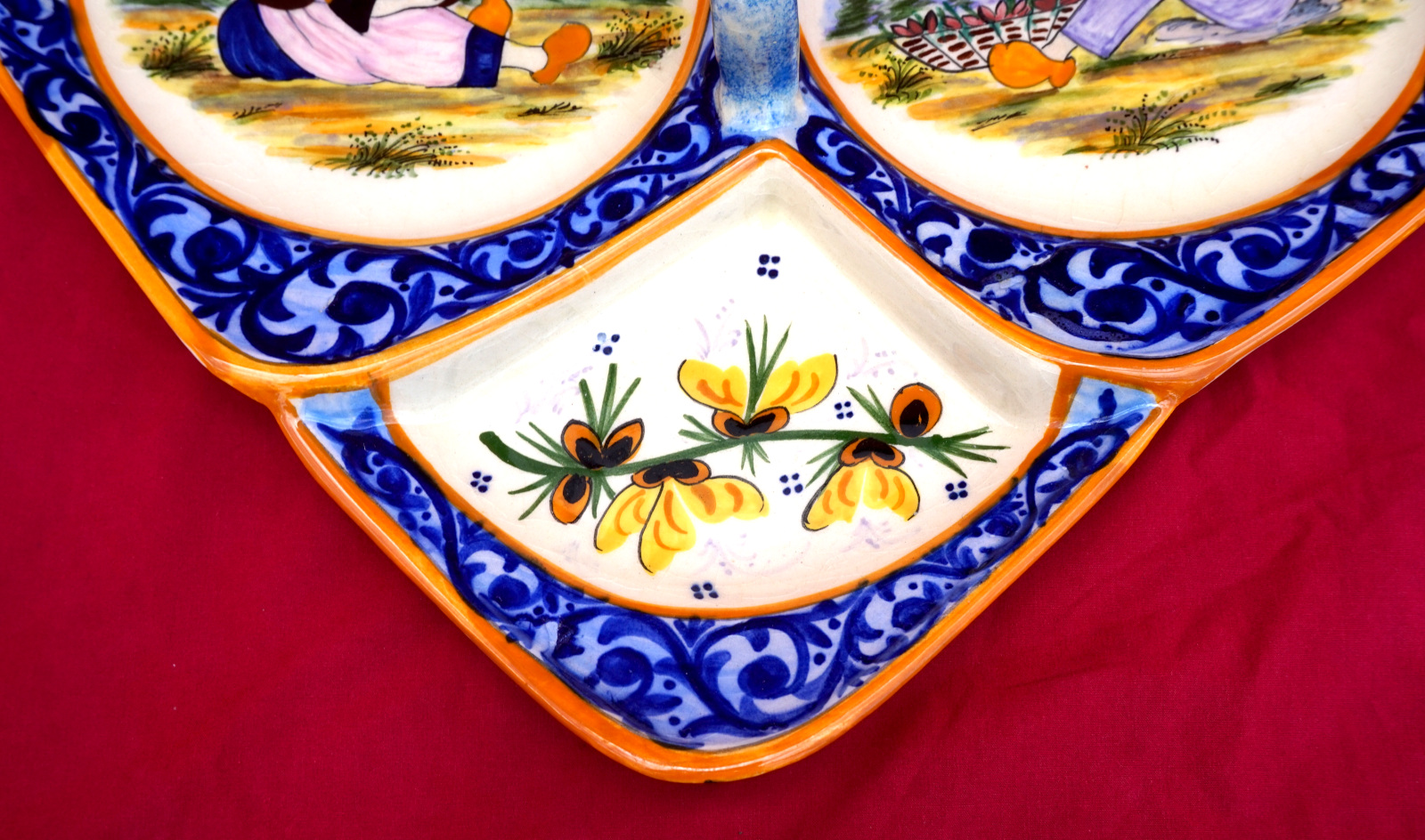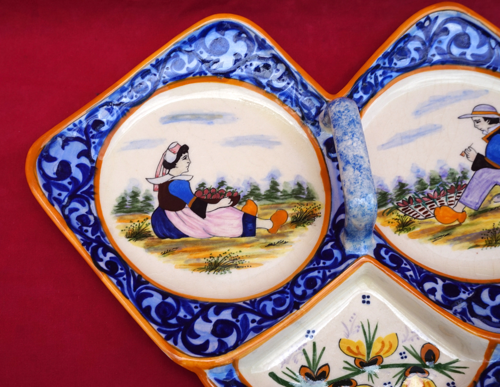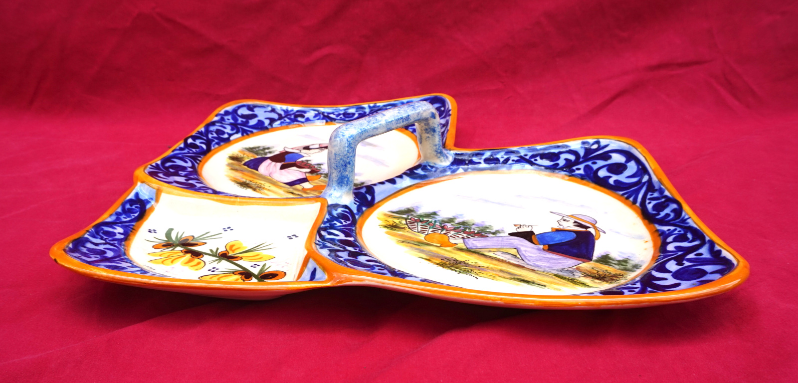 French hand painted faience trilobe hors d'oeuvre serving dish showing a couple of bretons surrounded by a decor riche border, Jo Kervella for HB Quimper mid-century. It's signed on the back.15" (38.1cm) length, 12" (30.5cm) width, 2" (5cm) height to the handle. Perfect condition.