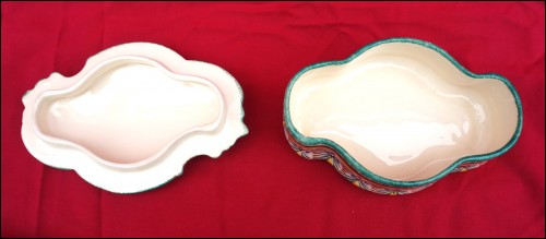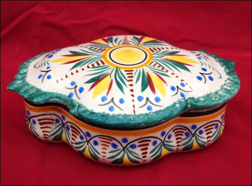 French hand painted faience covered scalloped box made by HB Quimper during the 1940's. It's signed on the back. 7 1/2" (18.5cm) length, 5 1/8" (13cm) width, 2 3/4" (7cm) height. Perfect condition as shown by the following pictures.