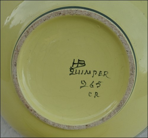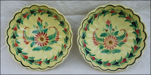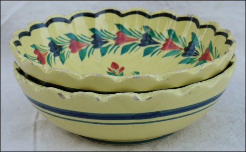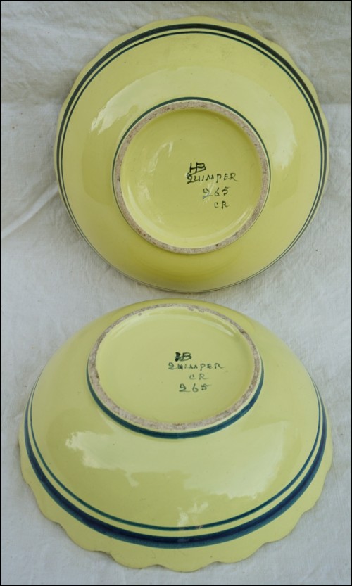 Vintage pair scalloped salad dishes hand painted with flowers on yellow background made by HB in Quimper during the middle of the 20th century. They are signed on the back. 8 7/8" diameter 3 1/8" height. Good condition no chips no cracks only a few glaze shortages on the edges as presented on the following pictures.