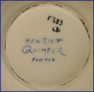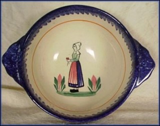 Beautiful Henriot Quimper bowl. It as a picture of a lady in her garden on the inside with great color: pink, green and blue and a thin line of orange around the inside. A name is painted of outside. This bowl is signed Henriot Quimper France F.383. L.B. is the painter mark. It measure 5" in diameter not counting the handles and it is 2"1/2 tall. It is perfect no chips, no cracks.