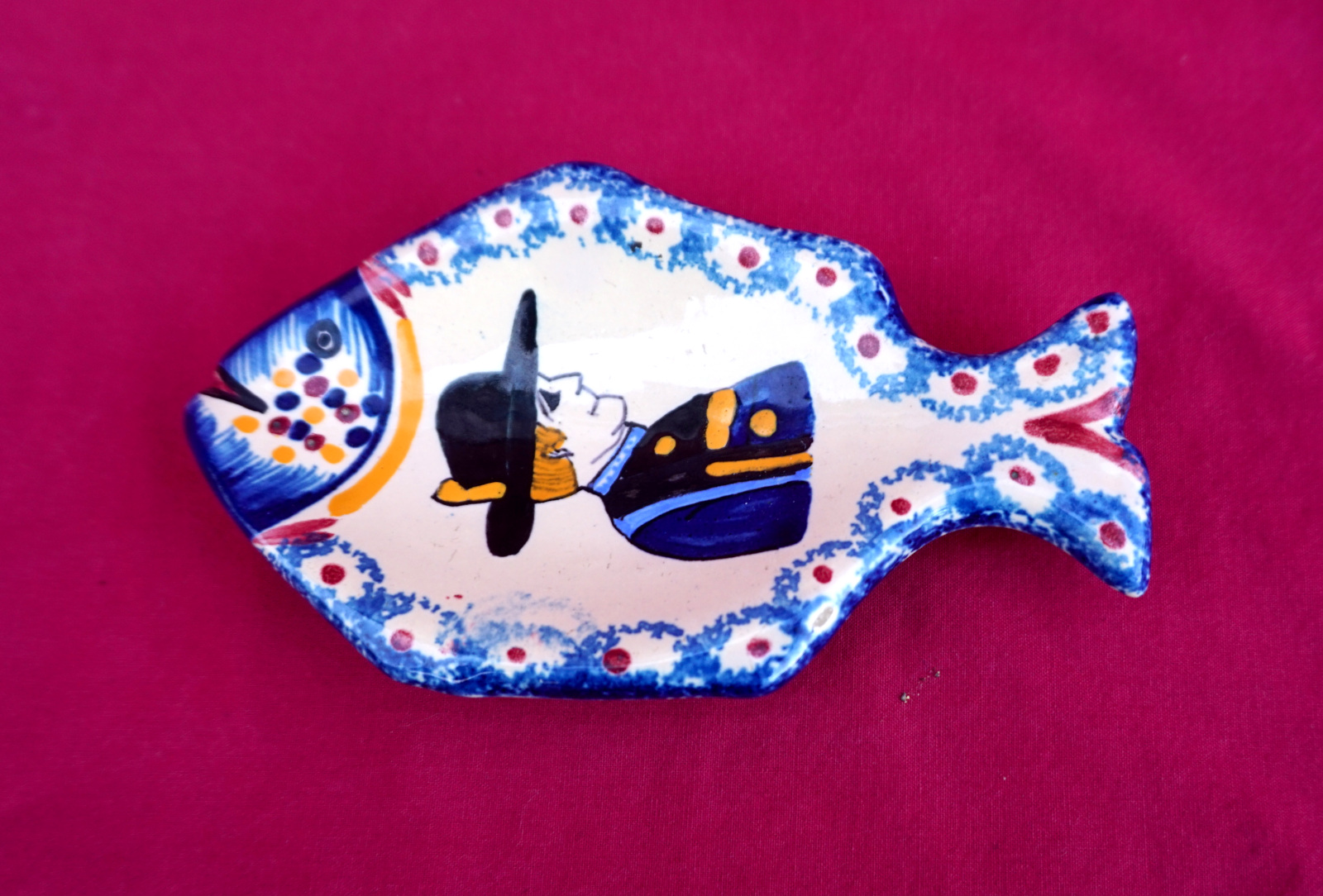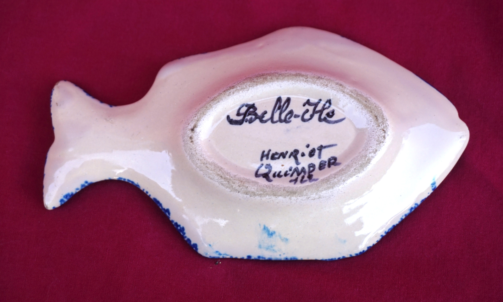 Petit saleron en forme de poisson peint à la main d'un jeune breton, Henriot Quimper pour Belle Ile. Longueur 11.5 cm, largeur 6.7 cm. Signé sur son fond. Parfait état.