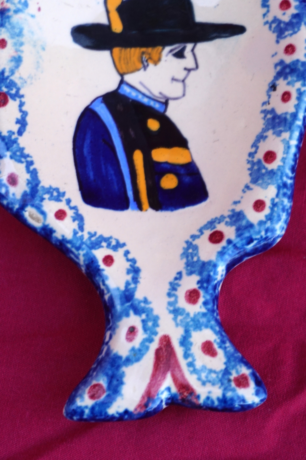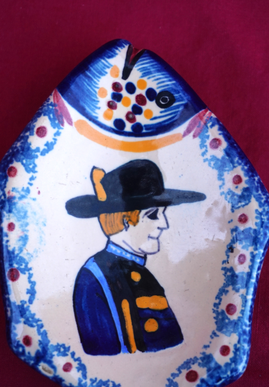 French hand painted faience fish shaped tidy ashtray or salt saucer showing a little breton made by Henriot Quimper. It's signed on the bottom. 4 1/2" (11.5cm) length, 2 56/8" (6.7cm) width. Perfect condition