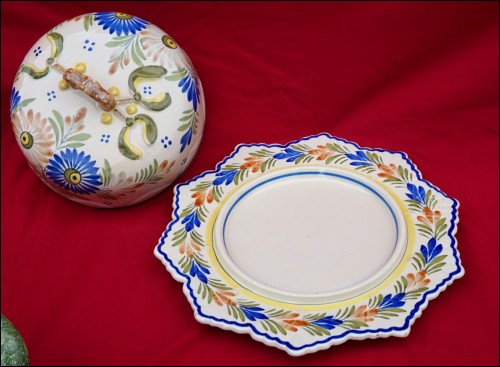 French hand painted faience butter, cheese, cake lidded dish with mistletoe decor made by Henriot Quimper early 20th century. They are signed inside the lid and on the back of the dish. 10 3/4" (27.3cm) diameter, 3 3/4" (9.5cm) height to the top of the handle. Perfect condition as shown by the following pictures.