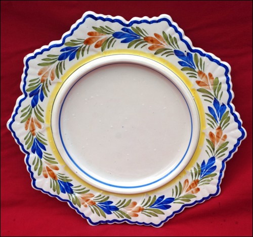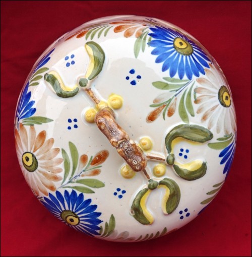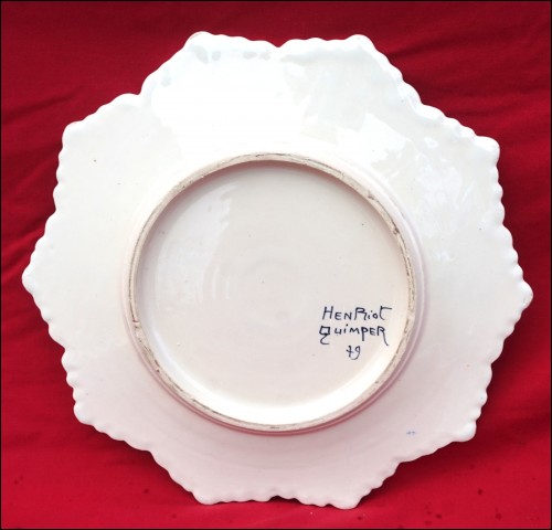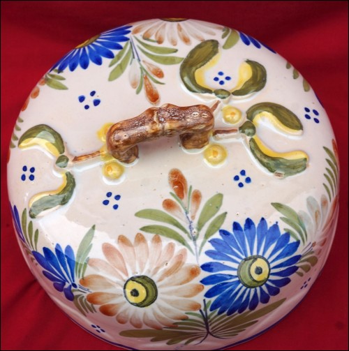 Grand beurrier à couvercle en faïence peinte à la main, décor "au gui l'an neuf" sur le couvercle, manufacture Henriot Quimper début XXe siècle. Le plat et le couvercle sont signés sur leurs fonds. Diamètre 27.3 cm, hauteur à l'anse 9.5 cm. Parfait état.