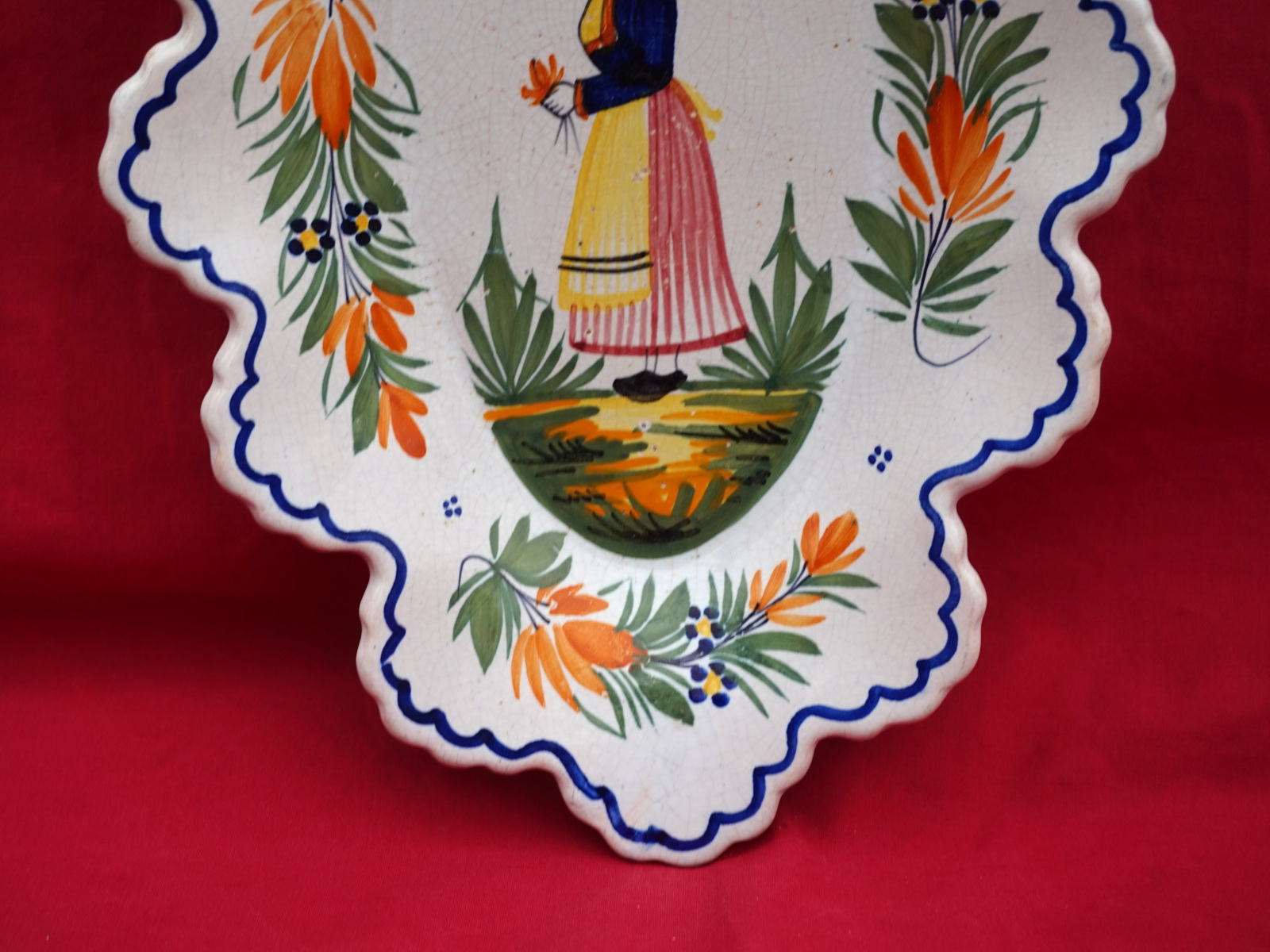 French hand painted faience scalloped oval dish showing little Bretonne surrounded by flowers by Henriot Quimper during the 1940's. It's signed on the back. 11 5/8" (29.5cm) length, 7 3/4" (19.5cm) width. Perfect condition with 2 holes on the back for hanging as shown by the following pictures.
