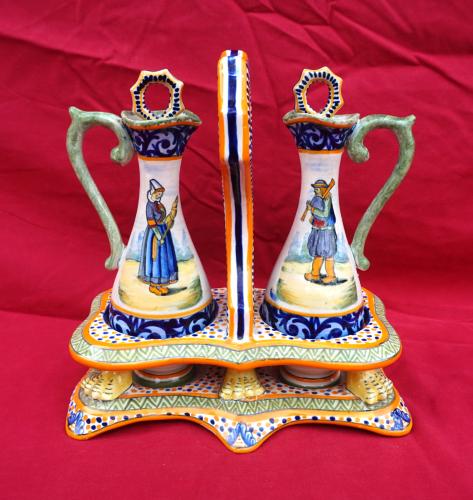 HENRIOT QUIMPER Oil Vinegar Set with Stand Couple Bretons Decor Riche Rare Early 20th C