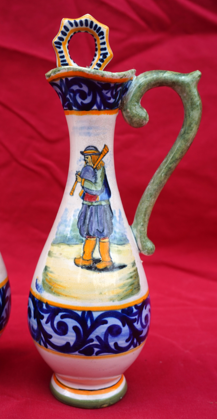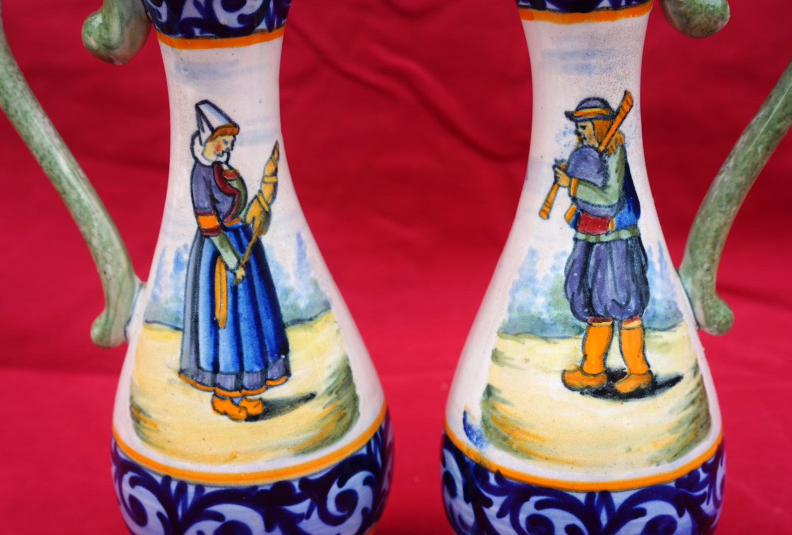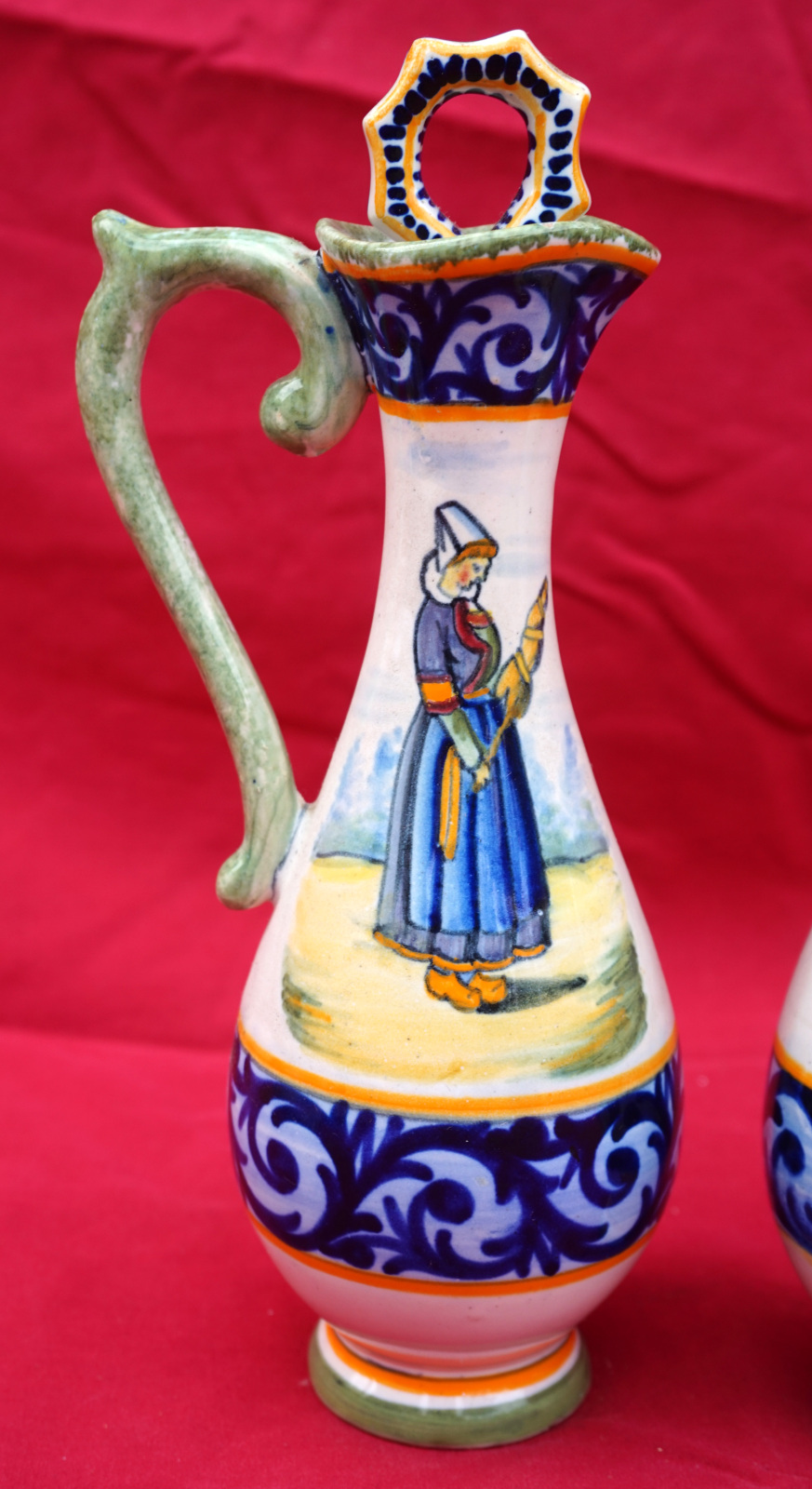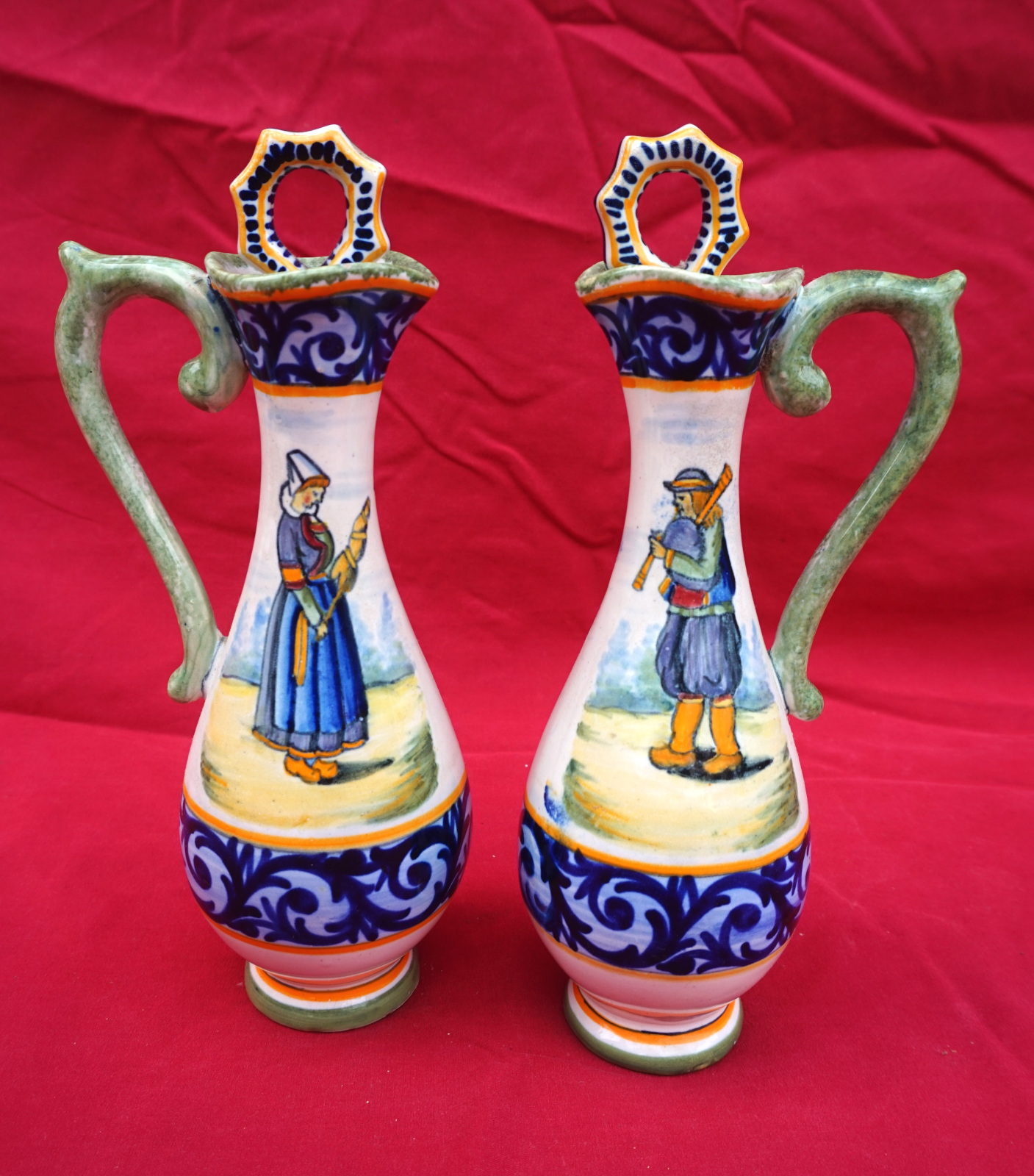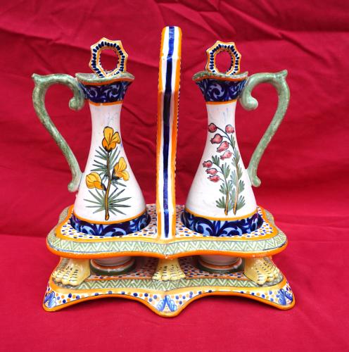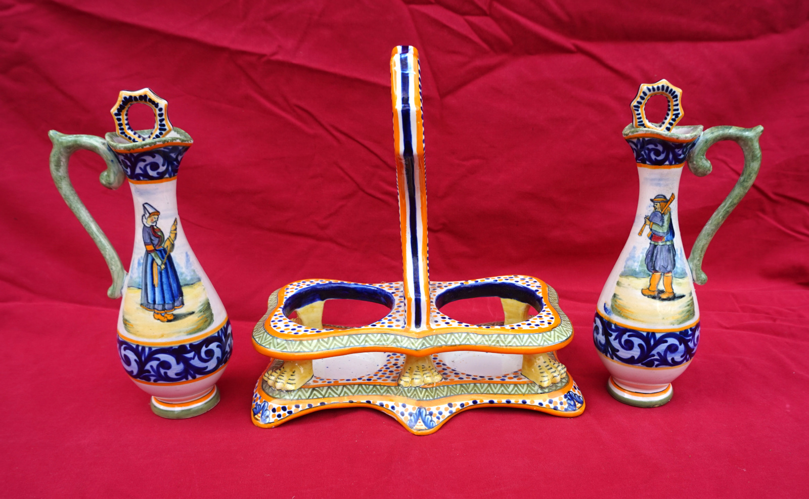 French hand painted faience oil and vinegar set with stand showing a couple of bretons with decor riche made by Henriot Quimper early 20th century. All the parts are signed and numbered on the back. 8 1/2" (21.5cm) total height, 8" (20.3cm) width, 4 1/4" (10.8cm) depth. Beautiful condition, complete, only a tiny glaze shortage on the top of the handle of a cruet