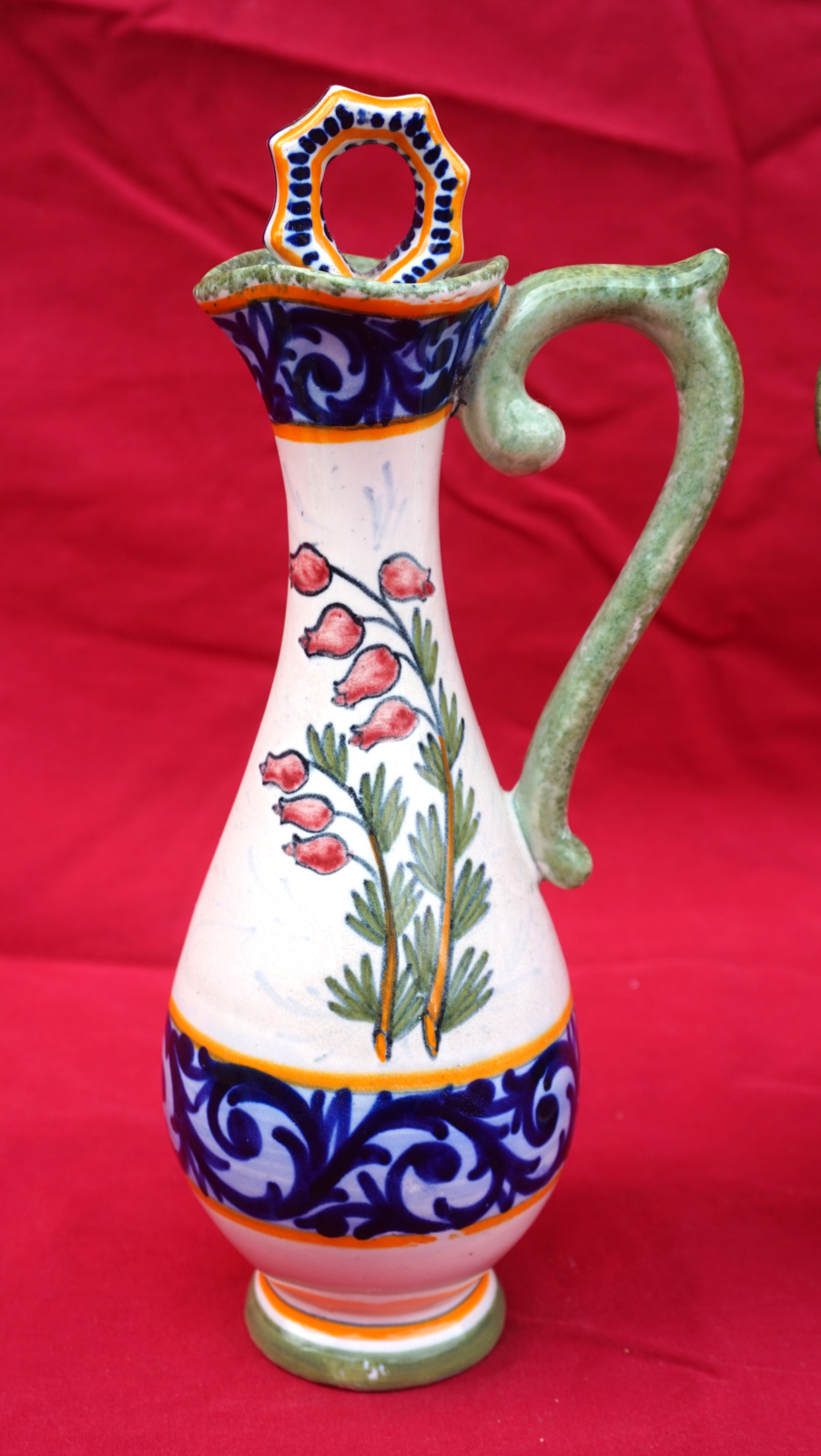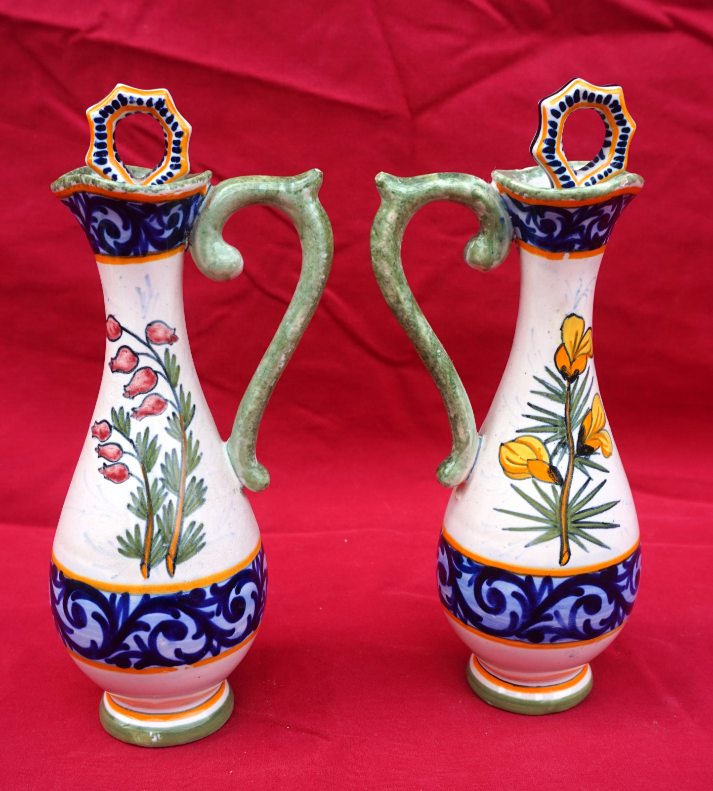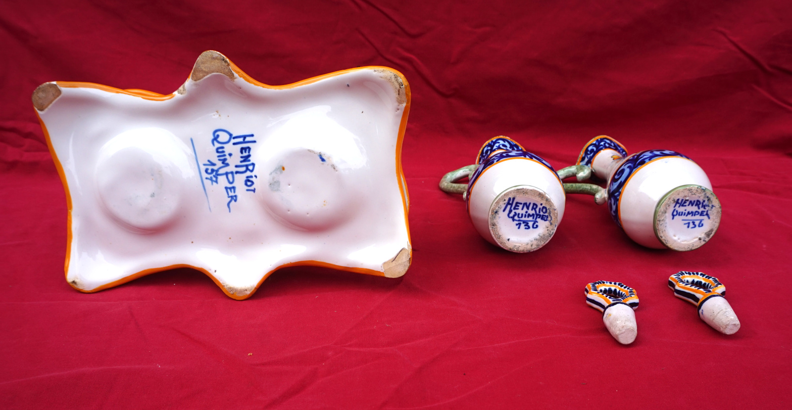 Huilier vinaigrier avec son support en faience peinte à la main d'un couple de Bretons et de fleurs sauvages, par Henriot Quimper début XX° siècle. Toutes les pièces sont signées Henriot Quimper et numérotées du modèle. Hauteur totale 21.5 cm, largeur 20.3 cm, profondeur 10.8 cm. Très bel état, un minuscule éclat de vernis sur une anse de flacon.