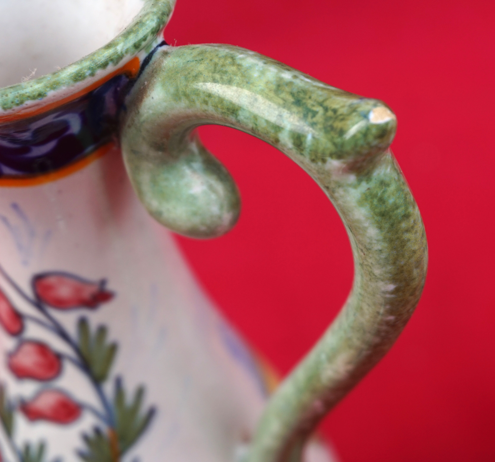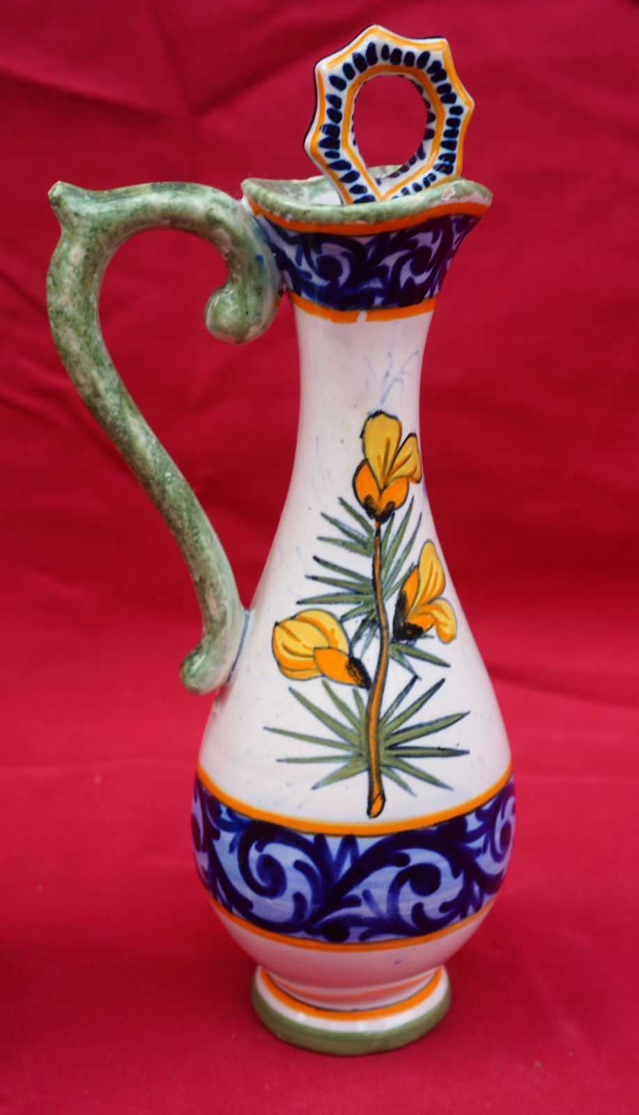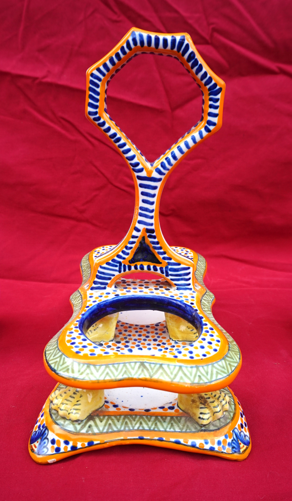 Huilier vinaigrier avec son support en faience peinte à la main d'un couple de Bretons et de fleurs sauvages, par Henriot Quimper début XX° siècle. Toutes les pièces sont signées Henriot Quimper et numérotées du modèle. Hauteur totale 21.5 cm, largeur 20.3 cm, profondeur 10.8 cm. Très bel état, un minuscule éclat de vernis sur une anse de flacon.
