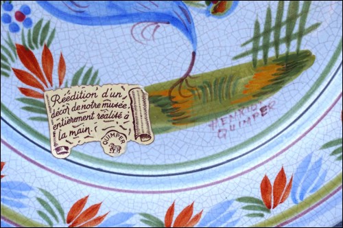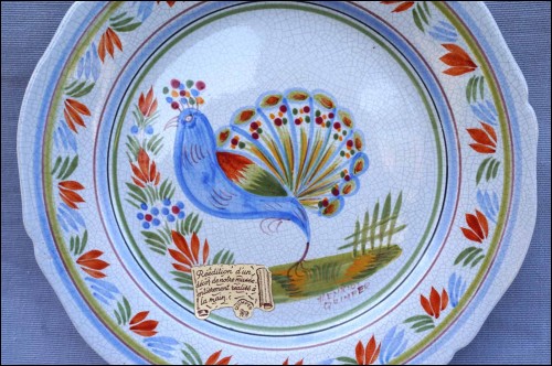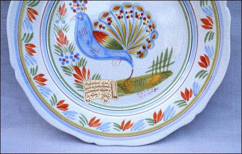 French hand painted faience scalloped plate showing peacock rooster made for the Quimper museum by Henriot Quimper during the 1980's. It's signed in front. 9 3/4" (24.8cm) diameter. Perfect condition as shown by the following pictures.