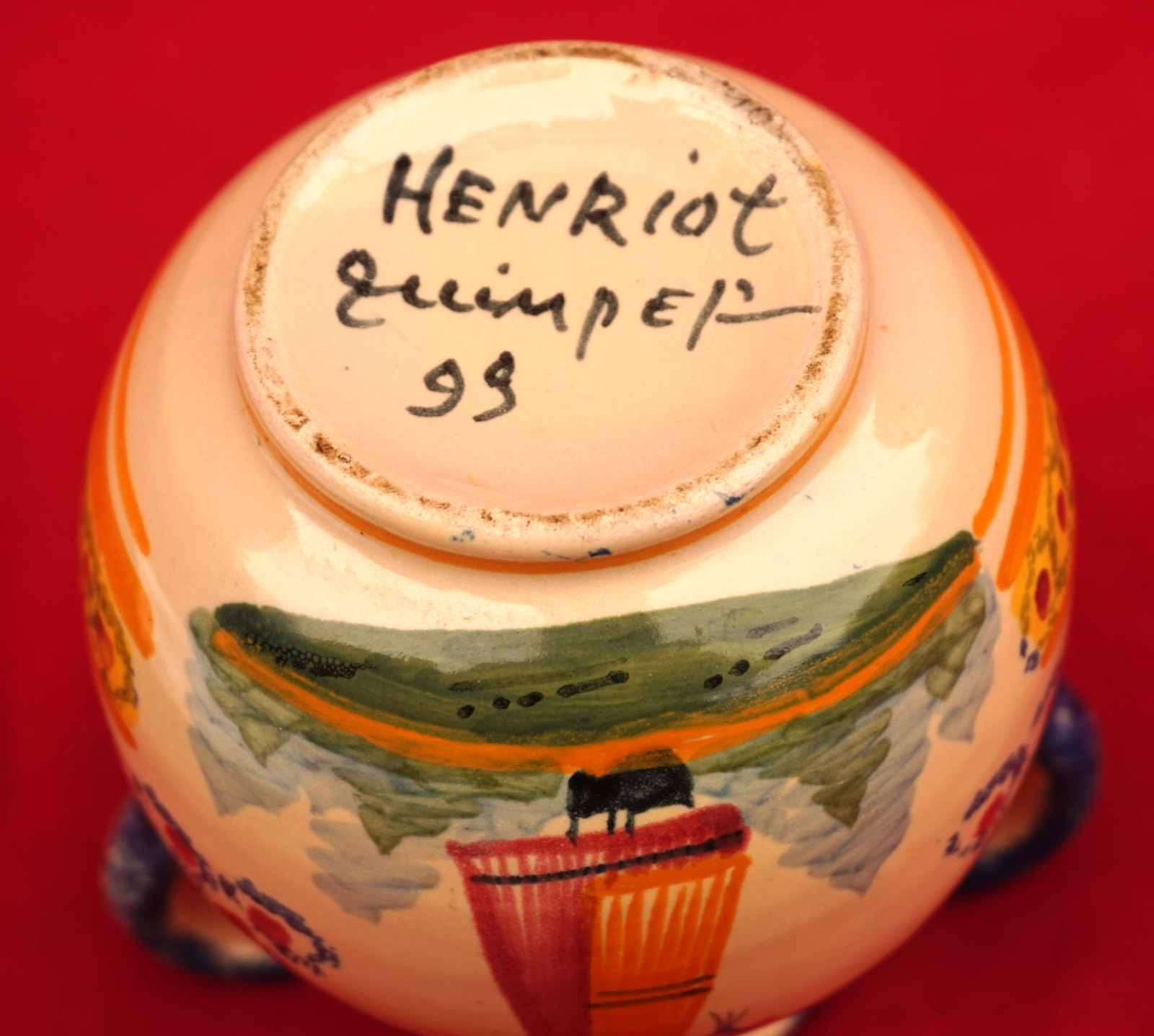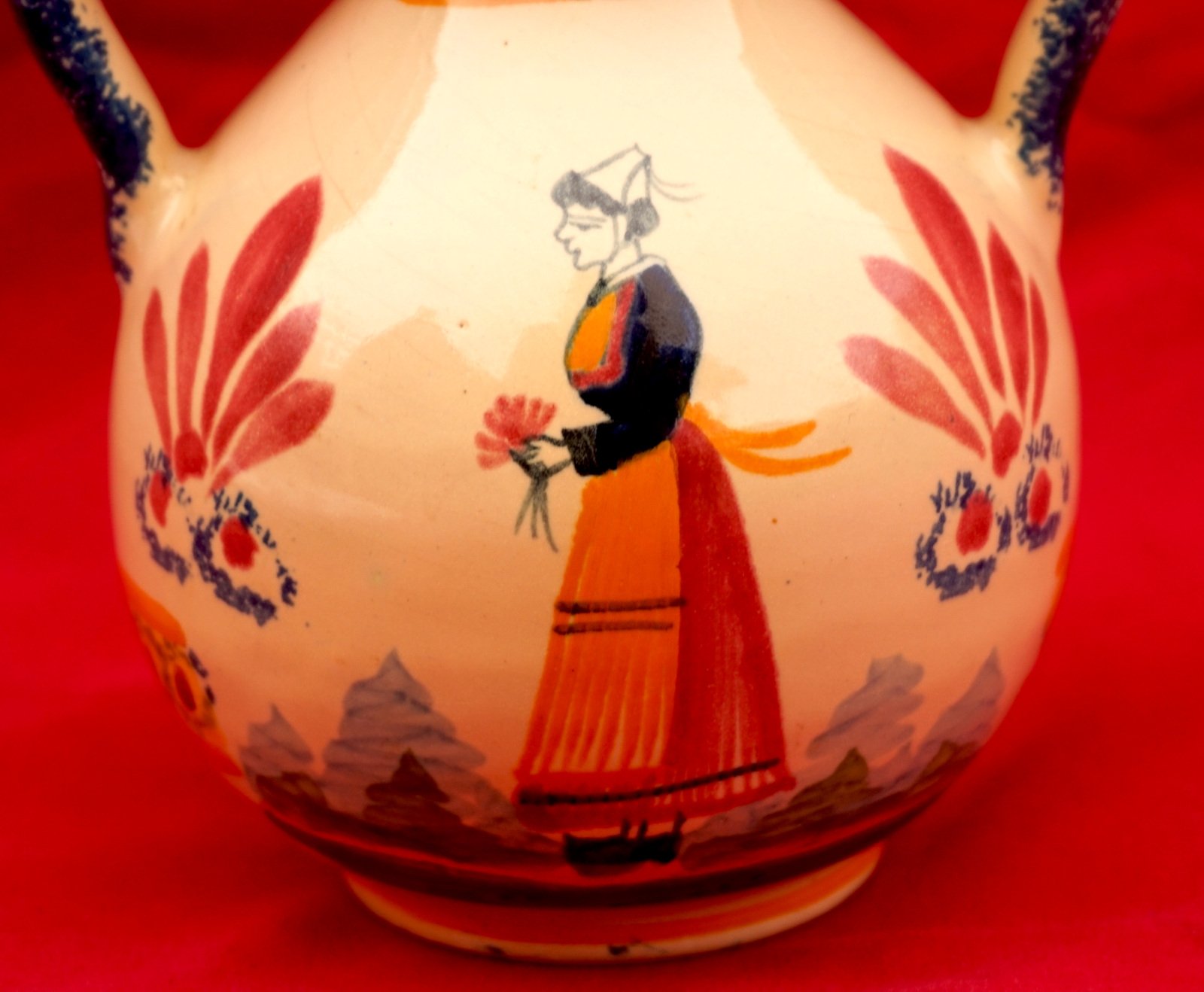 Petit vase à anse paint à la main d'une Bretonne, manufacture Henriot vers 1930's. Il est signé sur son fond. Hauteur 10.8 cm, largeur 10.2 cm, diamètre 9 cm. Parfait état.