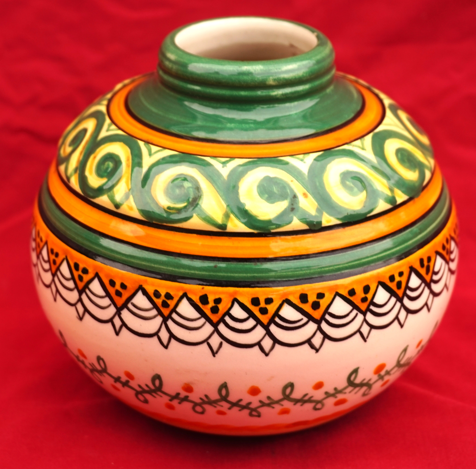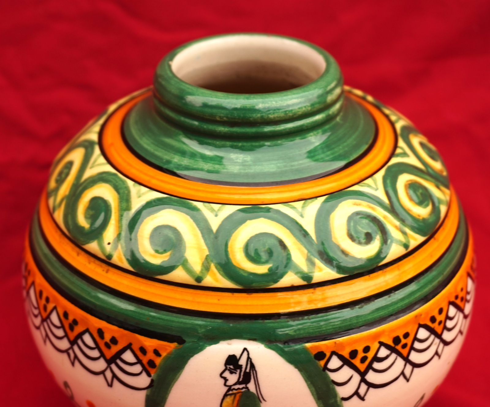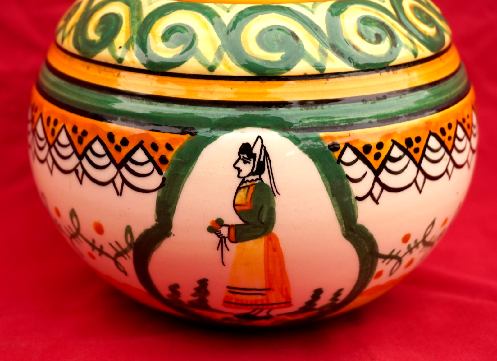 Vase boule à décor de rosaces et d'une Bretonne dfleurs à la main, manufacture Hneriot Quimper, vers 1950. Il est signé sur son fond. 5" (12.5cm) diameter to the body,; 4 3/4" (12cm) height. Très bel état, une micro manque de vernis sur le bord du col.
