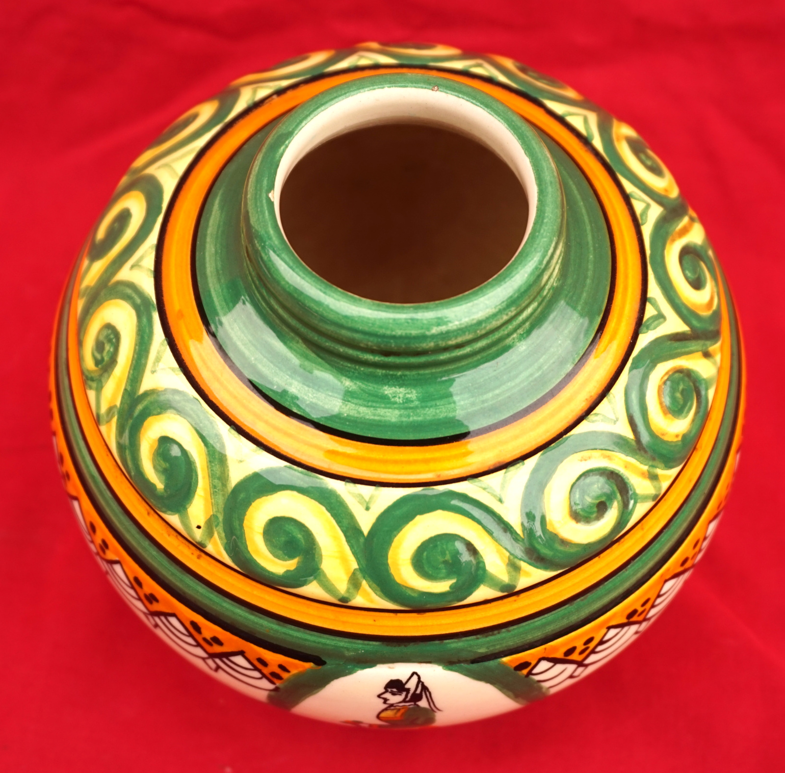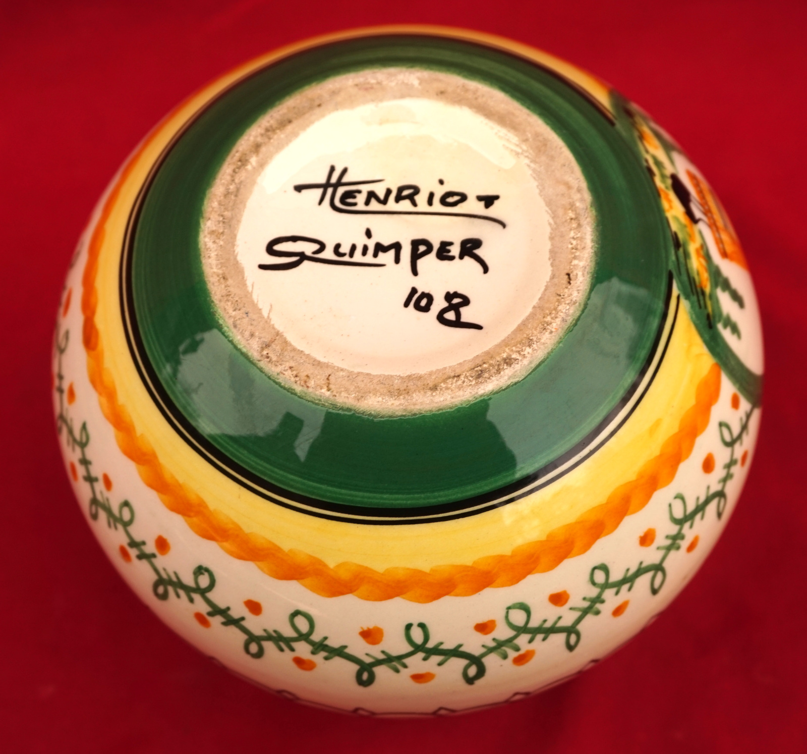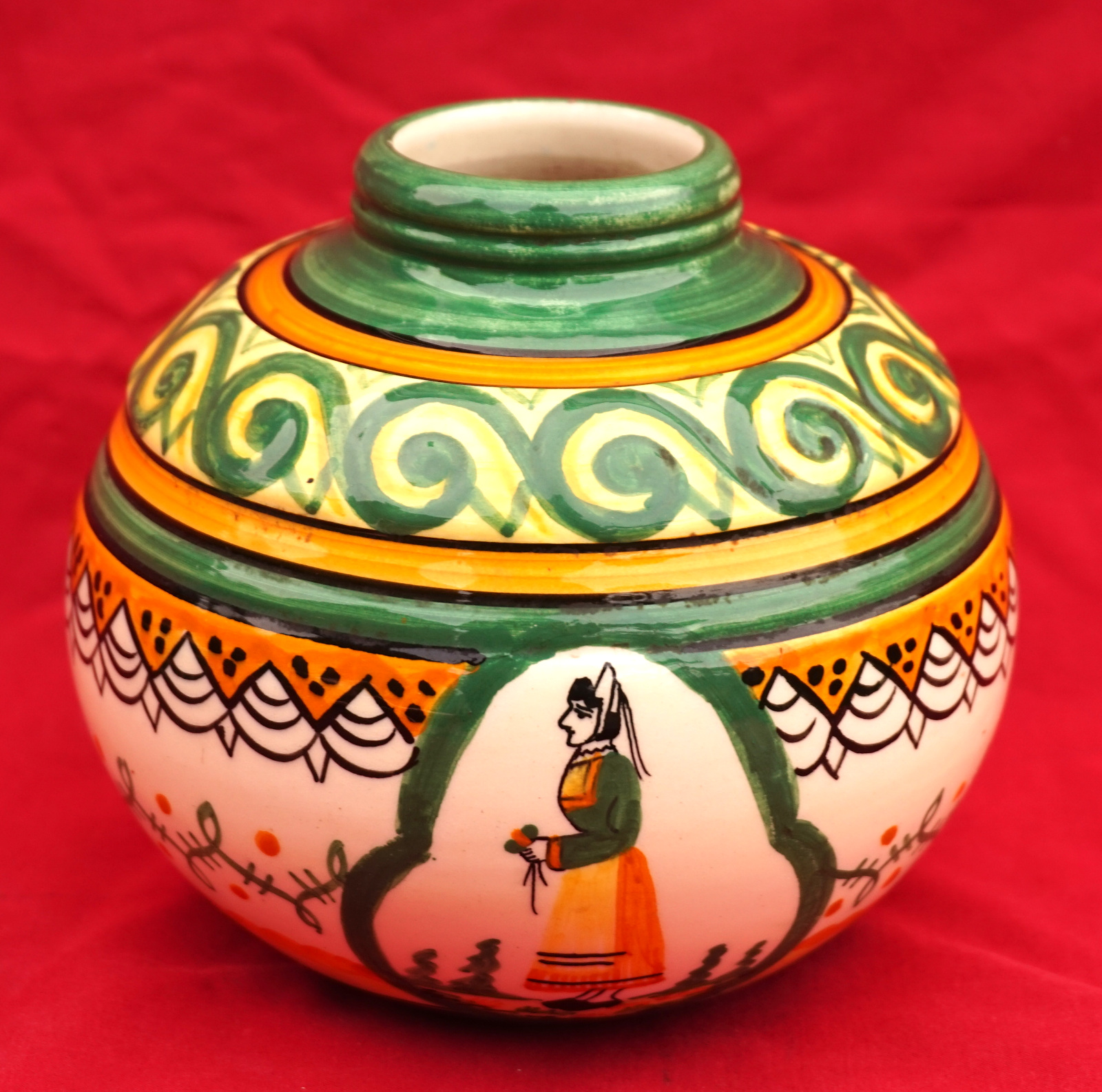 French hand painted faience small ball vase showing little Bretonne made by Henriot Quimper during the 1950's. It's signed on the bottom. 5" (12.5cm) diameter to the body, 4 3/4" (12cm) height. Beautiful condition a tiny glaze shortage on the edge of the top as shown by the following pictures.