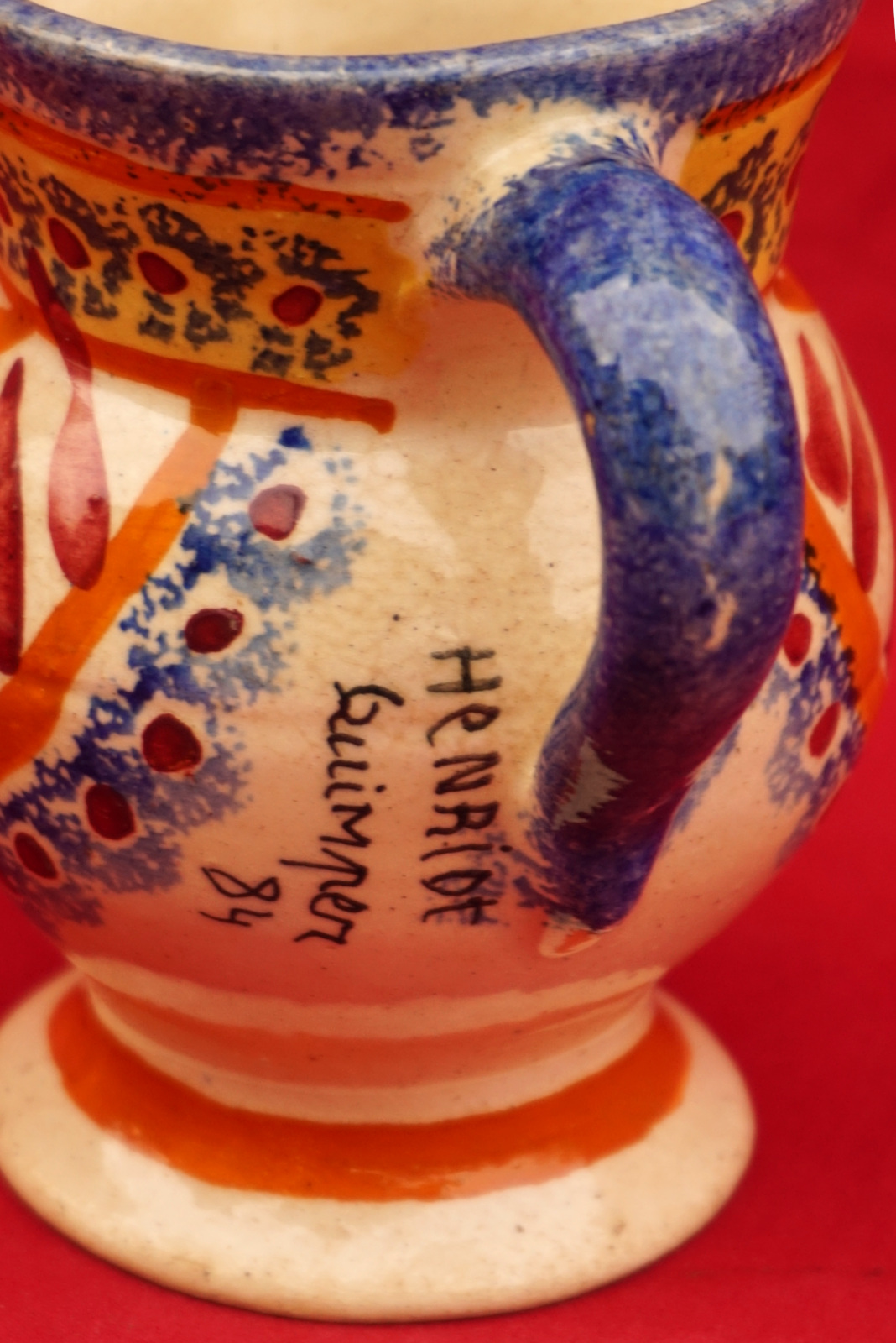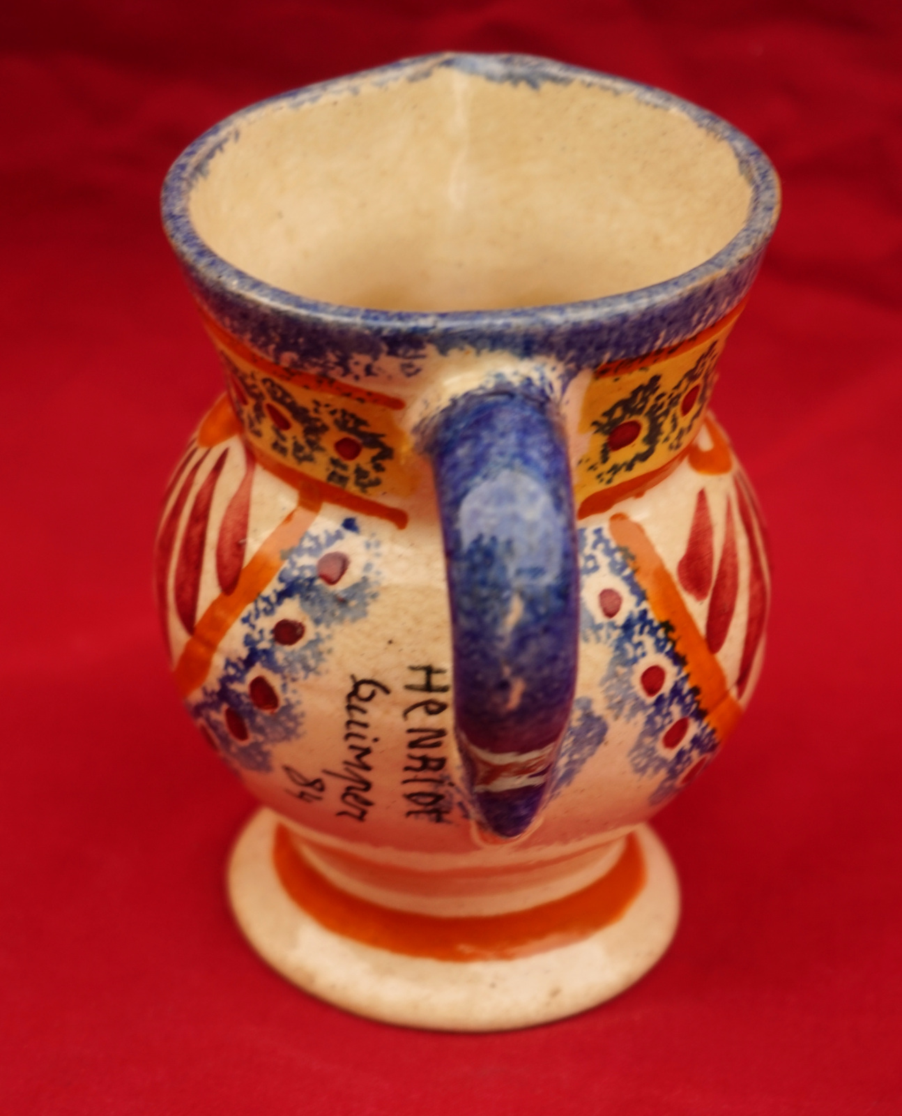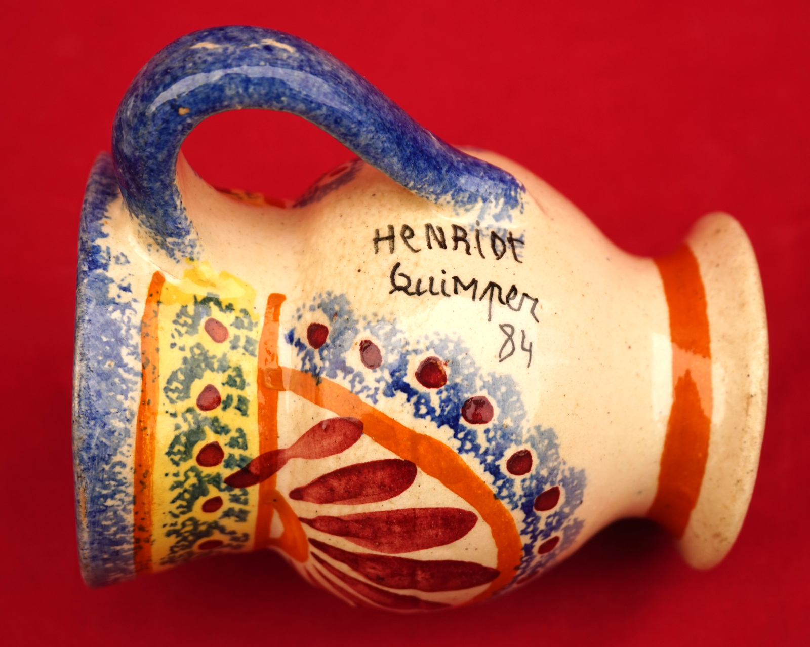 Petit pichet en faïence peinte à la main d'une Bretonne , manufacture Henriot Quimper vers 1930's. Il est signé sous l'anse. Largeur 9 cm, hauteur 8.5 cm. Parfait état.
