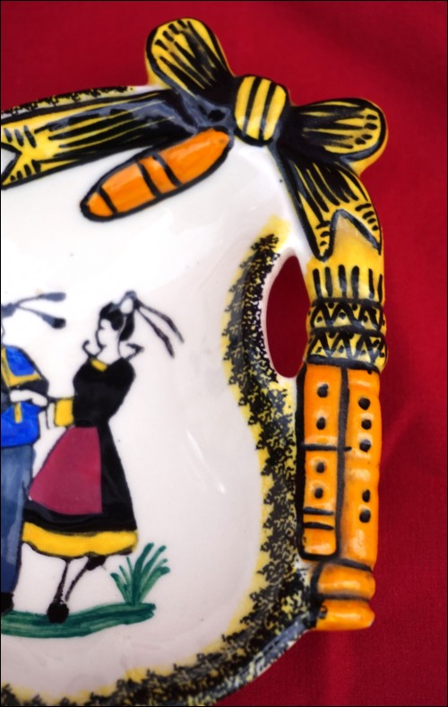Vintage french hand painted faience tidy bagpipe shaped and showing a couple of dancers made by Henriot Quimper during the 1960's. 5 1/8" (13cm) by 4 1/8" (10.5cm), 1 1/8" (3cm) depth. Perfect condition as shown by the following pictures.