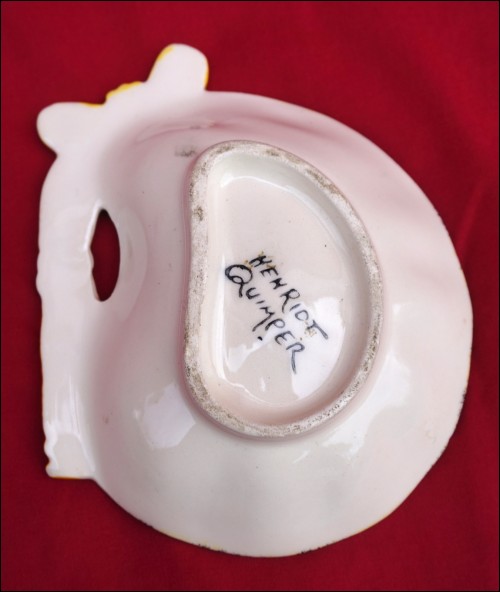 Ravier beure/sel en forme de cornemuse à décor de danseurs, faïence peinte à la main Henriot Quimper. Il est signé sur son fond. 13cm by 10.5cm, profondeur 3cm. Parfait état.