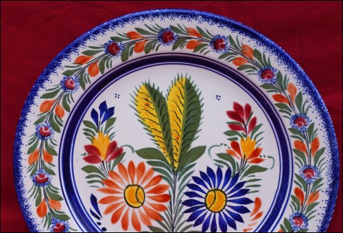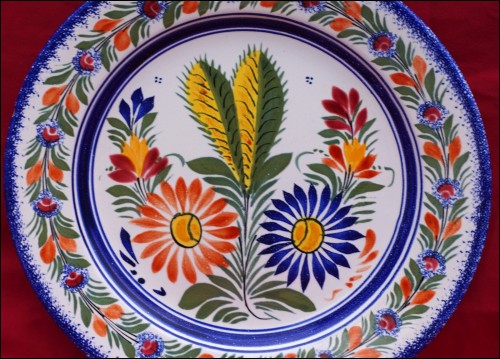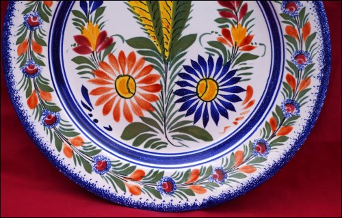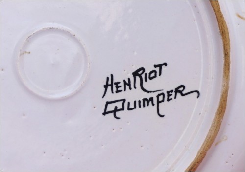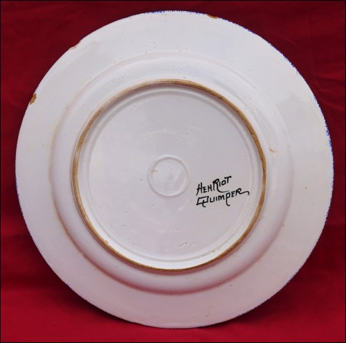 Vintage hand painted faience showing dahlia round dish made by Henriot in Quimper during the 1960's. It's signed on the back. 11 3/4" (30cm) diameter. Good condition 3 tiny chips on the edge of the back not visible in front as shown by the following pictures.
