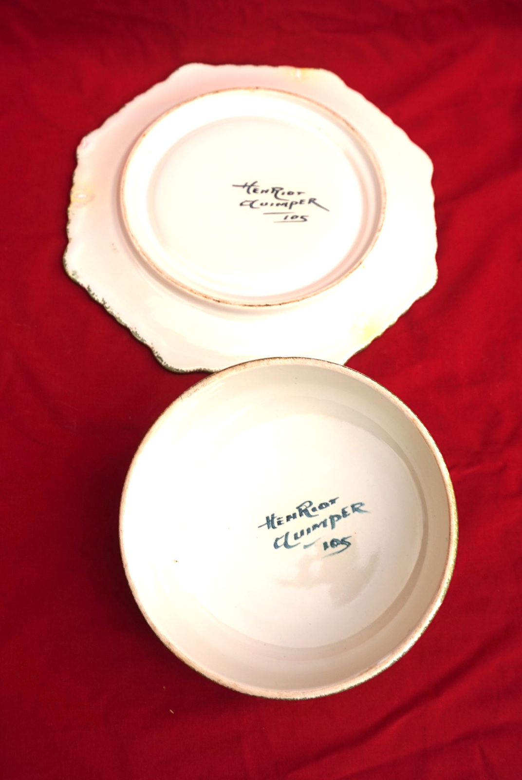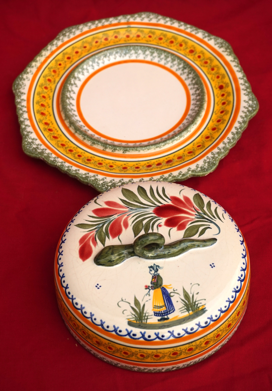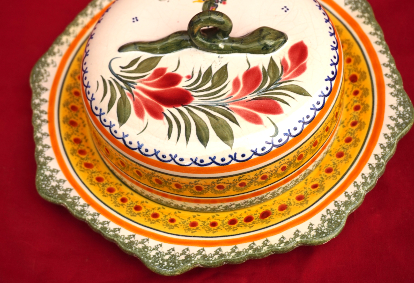 Vintage french hand painted faience lidded butter cheese serving dish showing little bretonne , snake and flowers made by Hanriot Quimper during the 1950's. They are signed on the back. 8 7/8" (22.5cm) total diameter, 3" (7.6cm) height. Beautiful condition a tiny chip on the edge of the back not visible in front as shown by the following pictures.