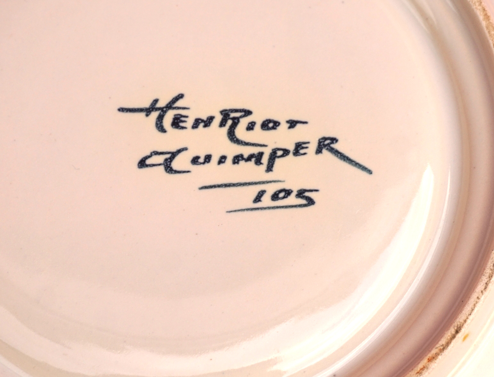 Beurrier à couvercle en faience peinte à la main d'une petite bretonne et d'un bouquet de fleurs par Henriot Quimper vers 1950. Il est signé sur son fond. Diamètre 22.5 cm, hauteur 7.6 cm. Très bel état, une petite égrenure sur le bord non visible du dessus.