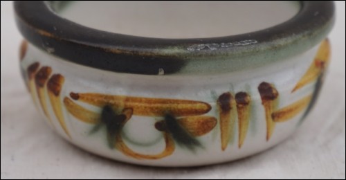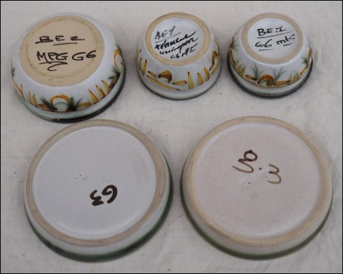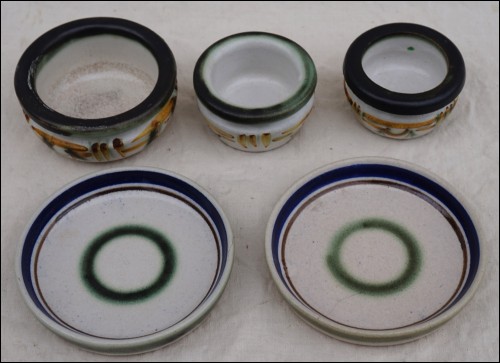 Ensemble en céramique peinte à la main pour le beurre , 3 beurriers et 2 coupe à beurre, de chez Keraluc Quimper vers 1960. Signés au dos. Dimensions, pour les coupelles: diamètre 10,4 cm. Très el état.