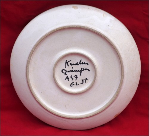 Vintage hand enameled ceramic plate in blue green and brown made by Keraluc in Quimper during the 1980's. It's signed on the back. 8 1/2" (21.5cm) diameter. Perfect condition as shown by the following pictures.