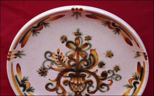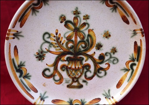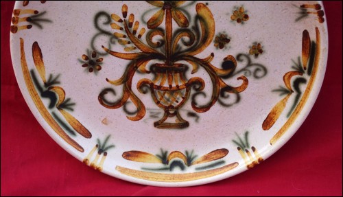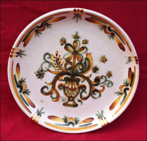 Vintage hand enameled ceramic plate in green and brown showing flowers in urn made by Keraluc in Quimper during the 1980's. It's signed on the back. 8 7/8" (22.5cm) diameter. Perfect condition as shown by the following pictures.