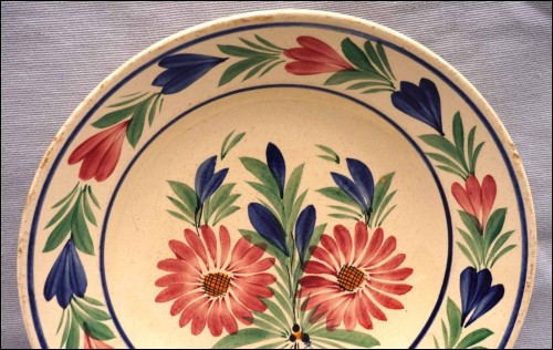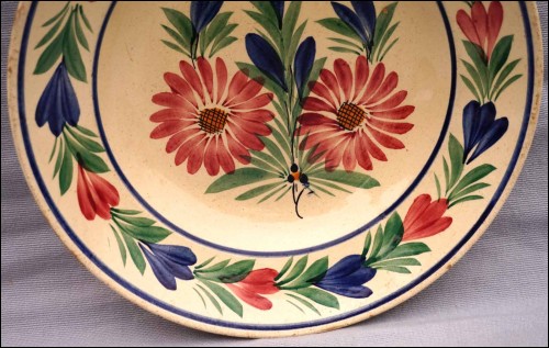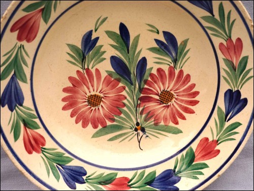 Vintage french hand painted faience cereal soup plate showing dahlias made by HB Quimper during the 1950's. It's signed on the back. 9 1/2" (24cm) diameter, 2" (5cm) height. Good condition , tiny chips on the edge as shown by the following pictures.