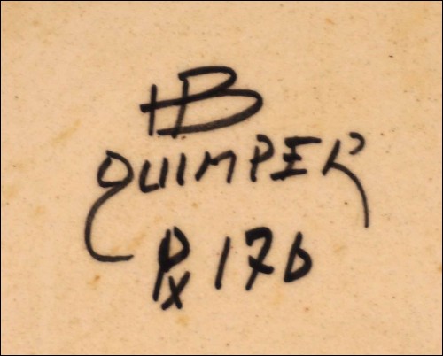 Assiette creuse de la manufacture HB de Quimper, née vers 1950. Elle est au décor des traditionnelles fleurs de dahlia breton, sur fond blanc. Elle est en bon état, surplus de pâte d'origine par endroit. Elle est signée sur son fond de la manufacture et du décorateur. Diamètre 23.5cm.