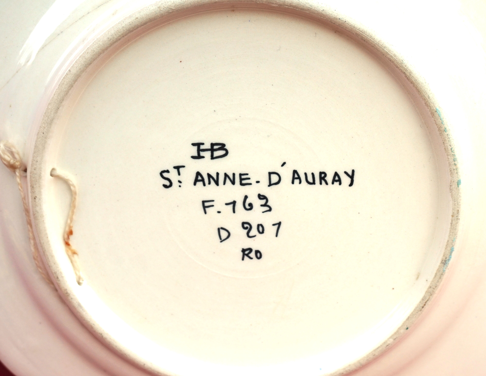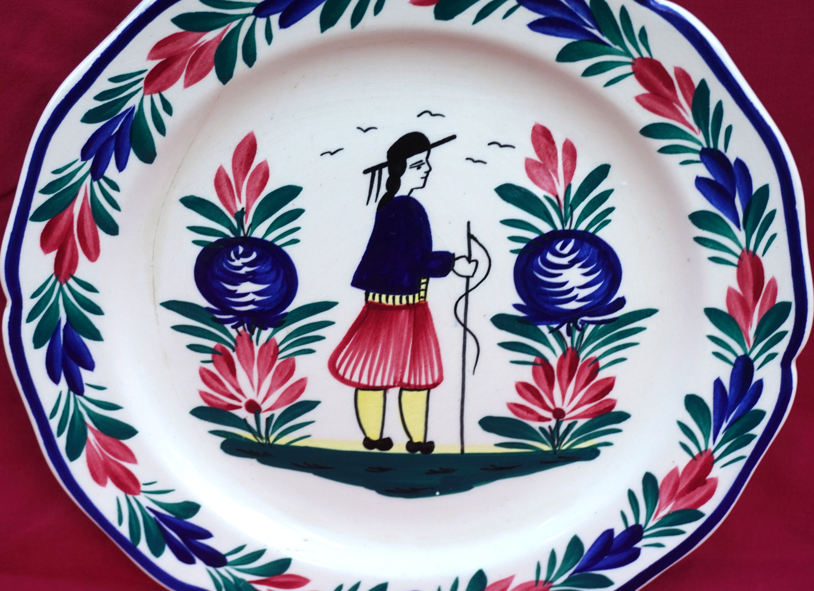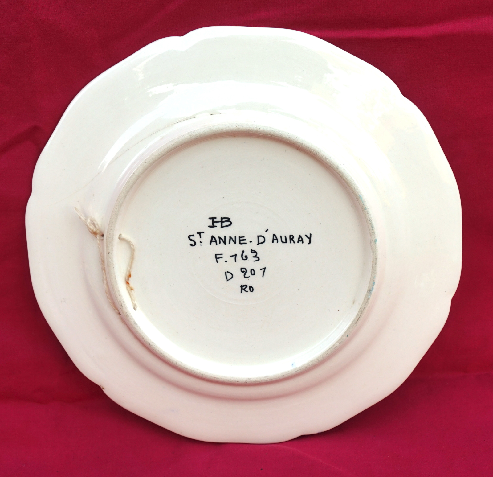 French hand painted faience scalloped plate made by HB Quimper for Ste Anne d'Auray town during the 1950's. It's signed on the back. 9 7/8" (25cm) diameter. Hairline on the edge at 9h.