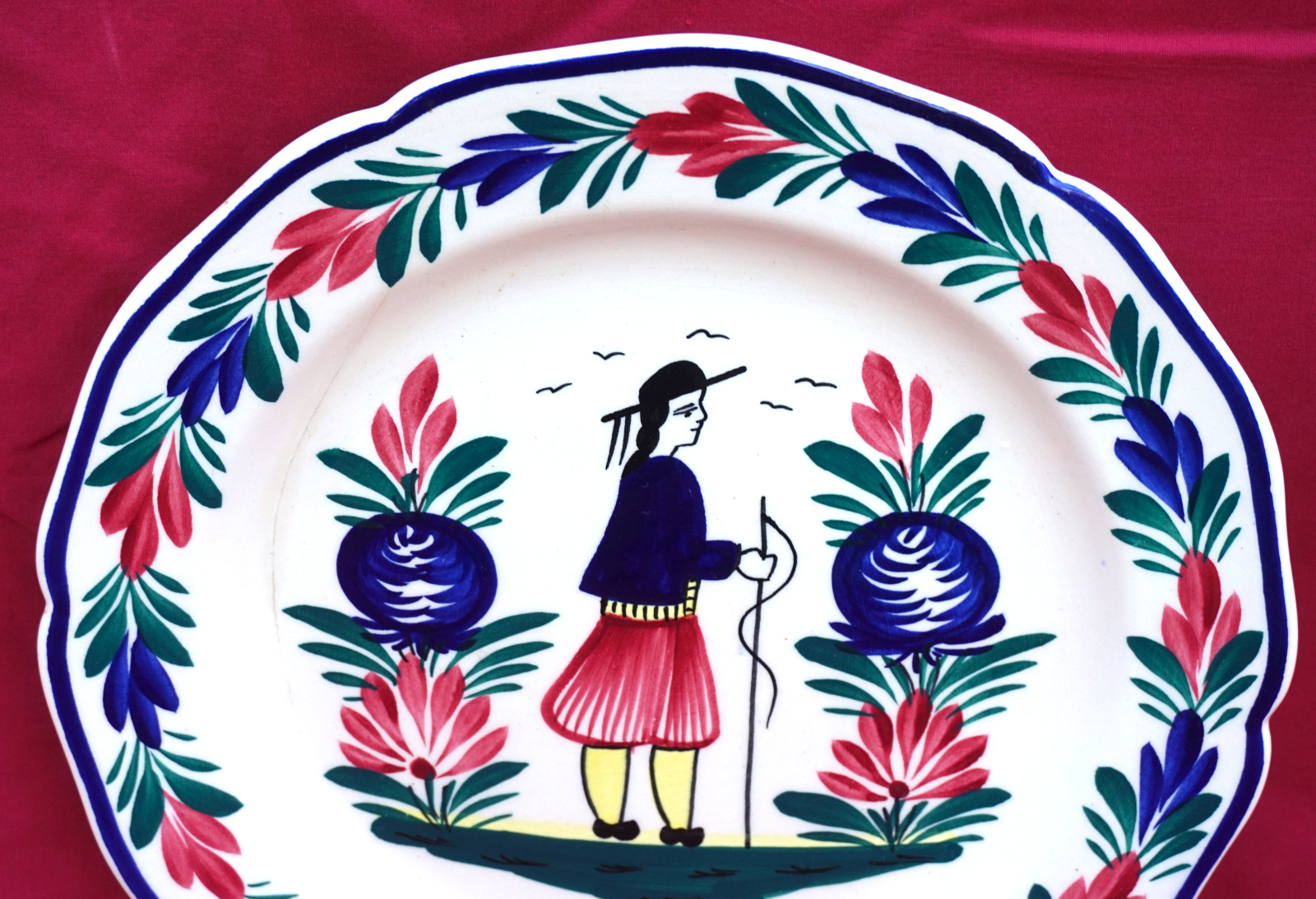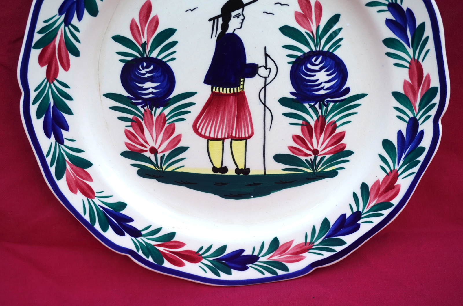 Assiette en faience peinte à la main d'un décor d'un Breton , manufacture HB Quimper vers 1950. Elle est signée sur son fond. Diamètre 25 cm. Bel état, un petit cheveu sur l'aile de l'assiette.