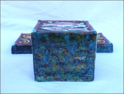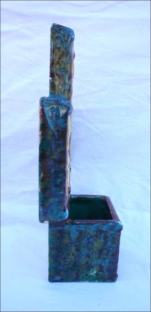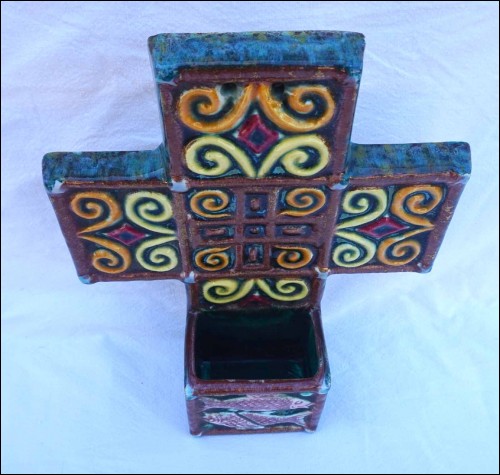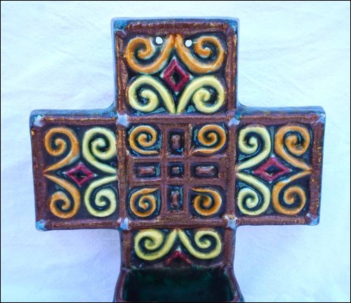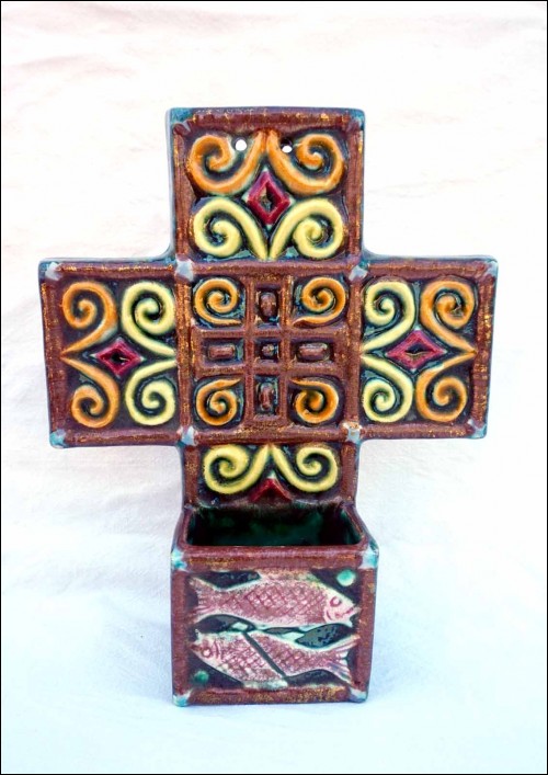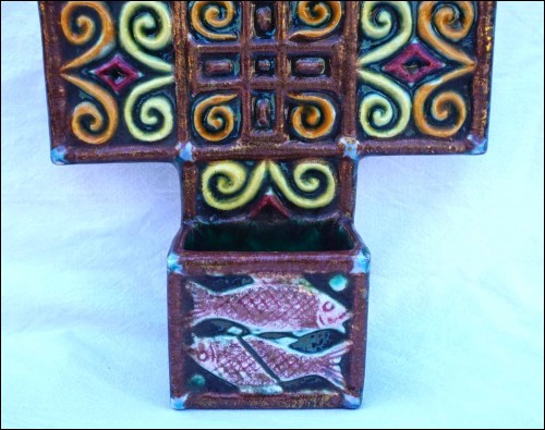 French hand painted faience large holy water font with fish and armoric decor made by René Quillivic ( 1879-1969) for HB in Quimper. It's signed on the back and dated 1927. 11 3/4" (29.7cm) height, 9 3/4" (24.7cm) width, 3 1/4" (8.3cm) depth, weight 3lb 14.78oz (1.780 kilogram). Perfect condition with 2 holes for hanging as shown by the following pictures.