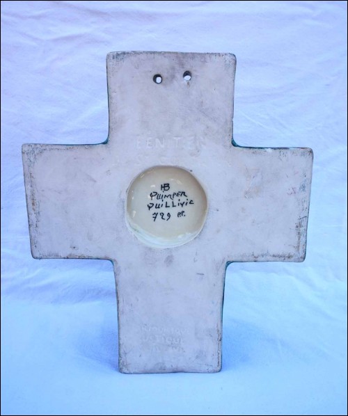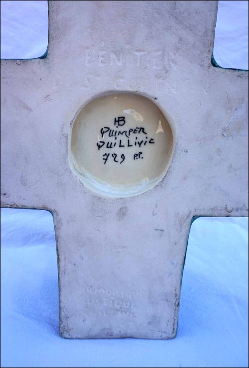 Bénitier de St Corentin, décor Armorique Rustique en faïence émaillée par René Quillivic (1879-1969) pour HB Quimper en 1927. Il est signé sur son fond. Hauteur 29.7cm, largeur 24.7cm, profondeur 8.3cm, poids 1.780kg. Parfait état.