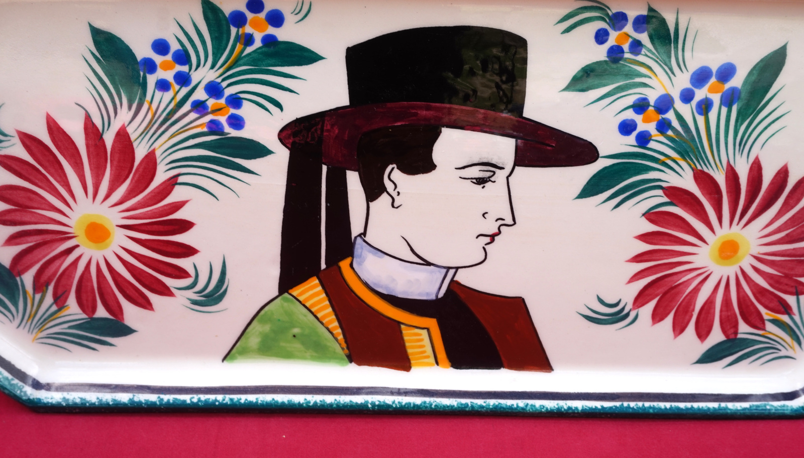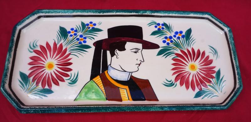 Vintage french hand painted faience rectangular platter tray showing Breton made by J Kervella for HB Quimper during the 1960's. It's signed  on the back. 13" (33cm) length, 6 1/4" (16cm) width. Perfect condition.