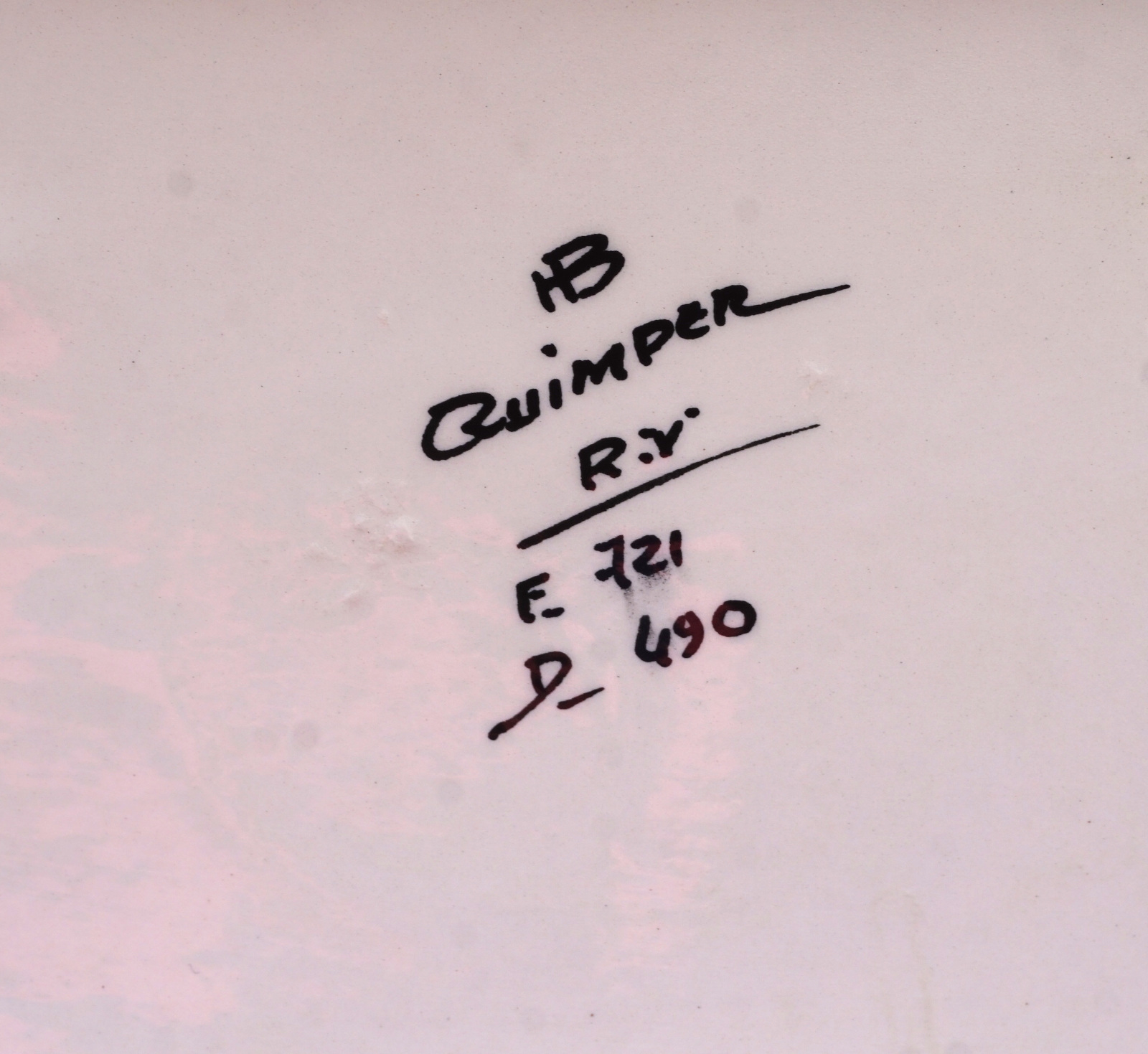 Plat à cake en fience peinte à la main d'un breton, décor de jos Kervella, par HB Quimper vers 1950's. Il est signé sur son fond. Longueur 33 cm, largeur 16 cm. Parfait état.