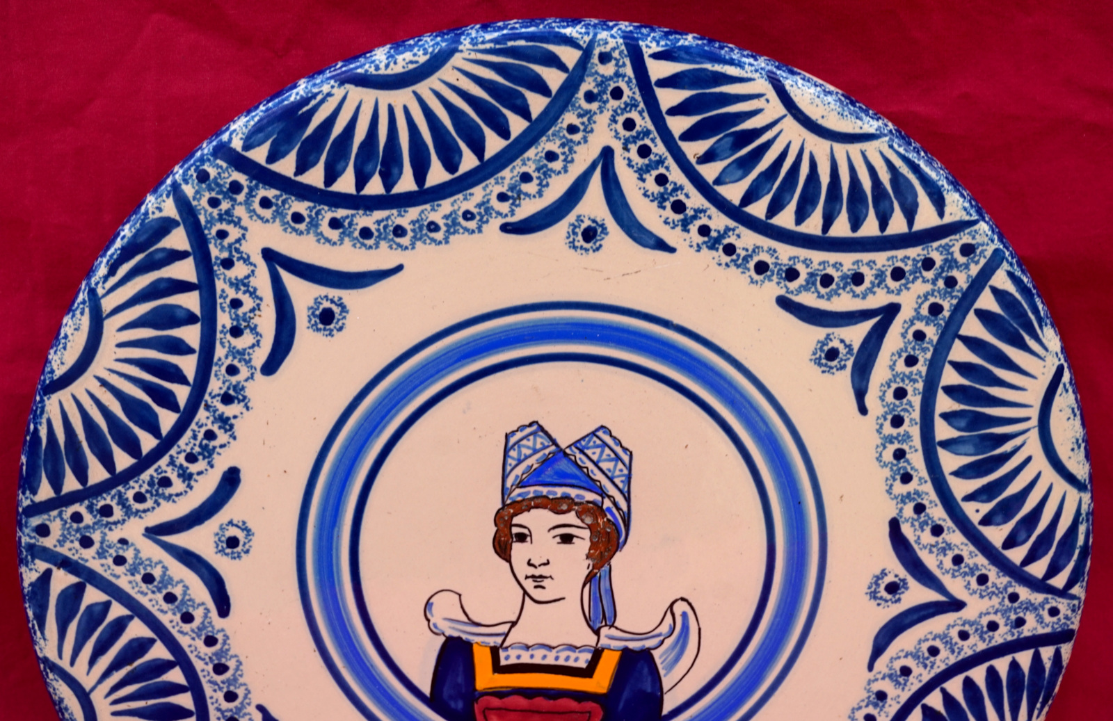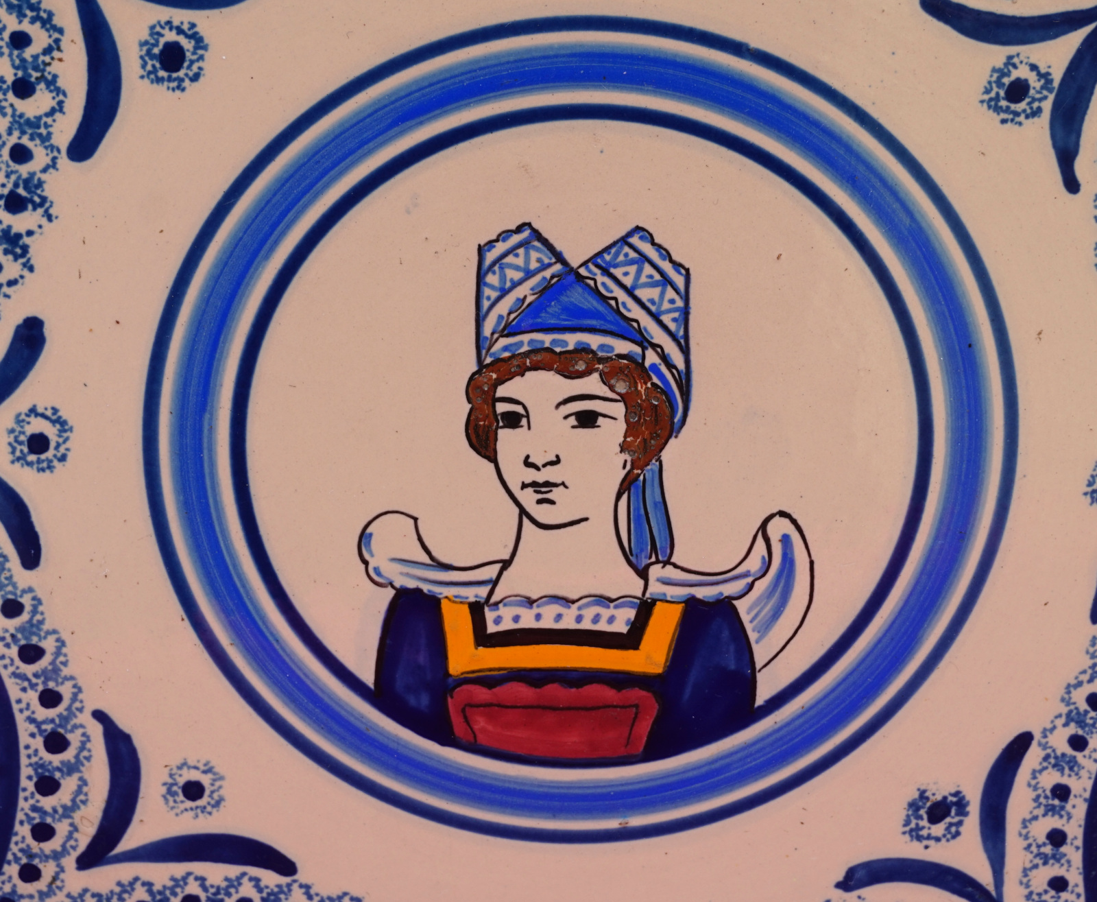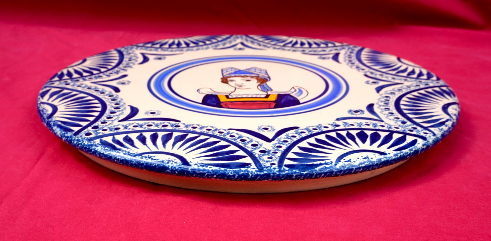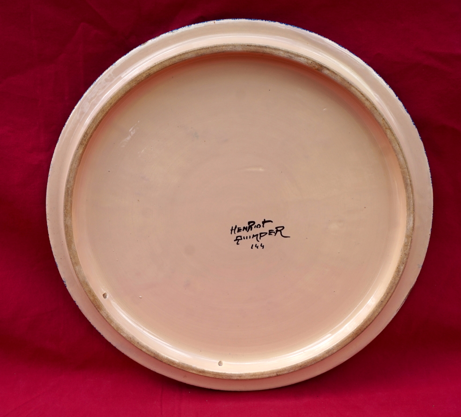 Dessous de plat décor corbeille bleu avec une bretonne en médaillon manufacture Henriot Quimper vers 1950. Il est signé sur son fond. Diamètre 28.5 cm. Parfait état.