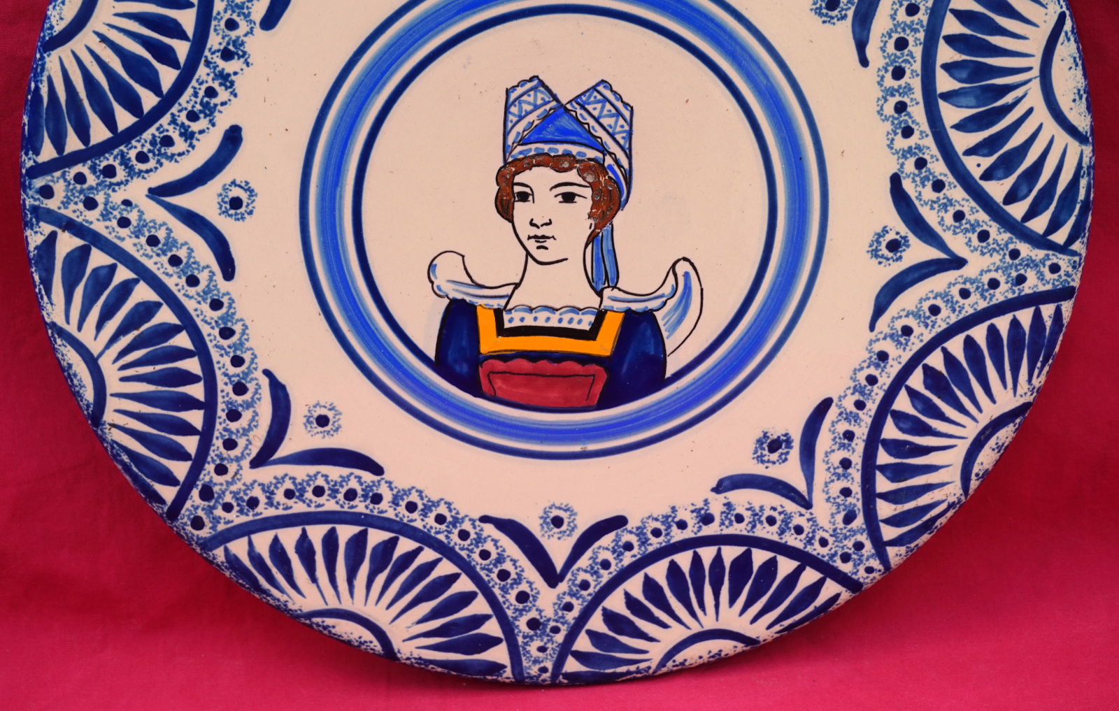 French hand painted faience pie cake serving platter showing Breton surrounded by blue corbeille decor made by Henriot Quimper during the 1950's. It's signed on the back. 11 1/4" (28.5cm) diameter. Perfect condition.