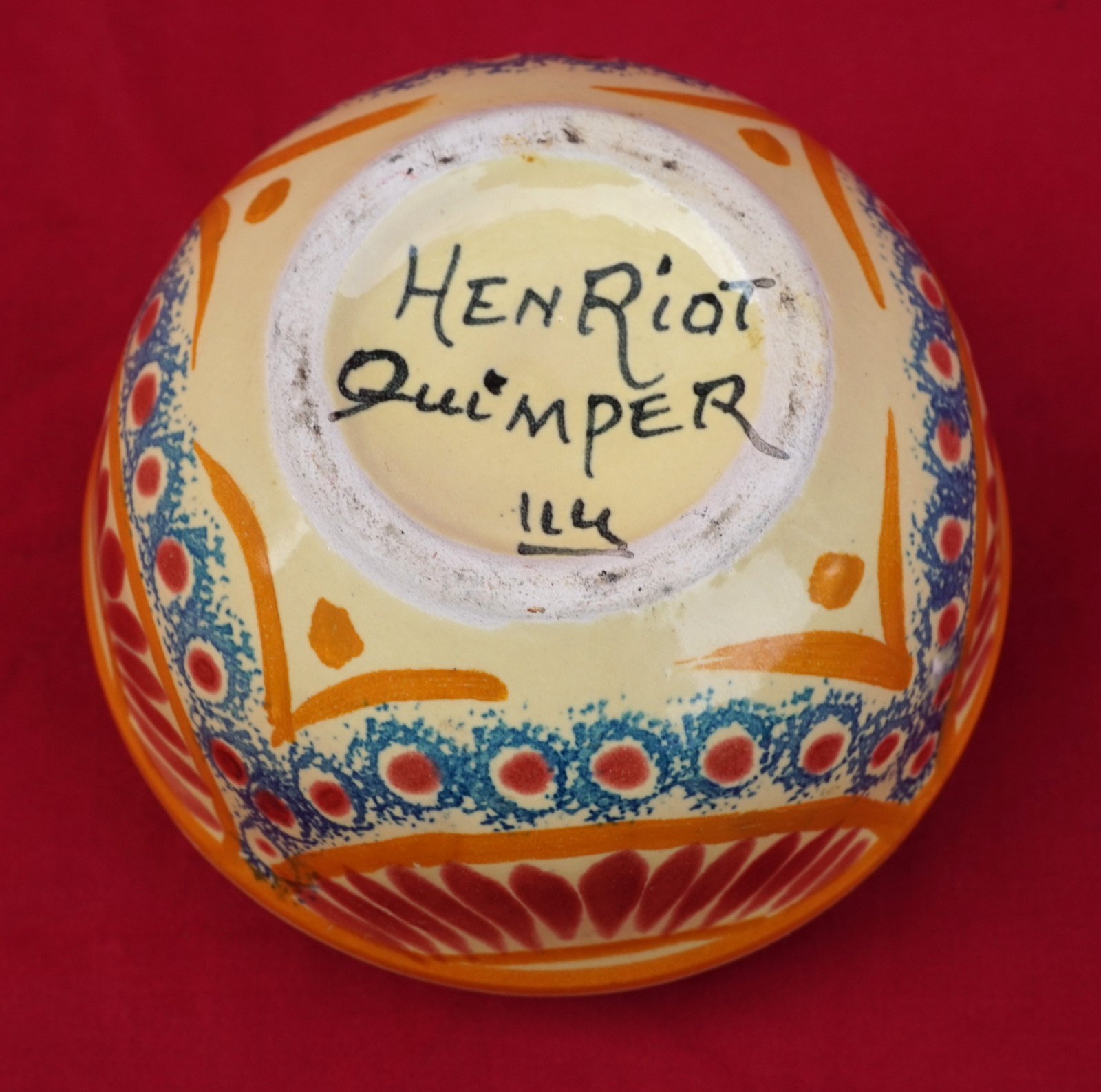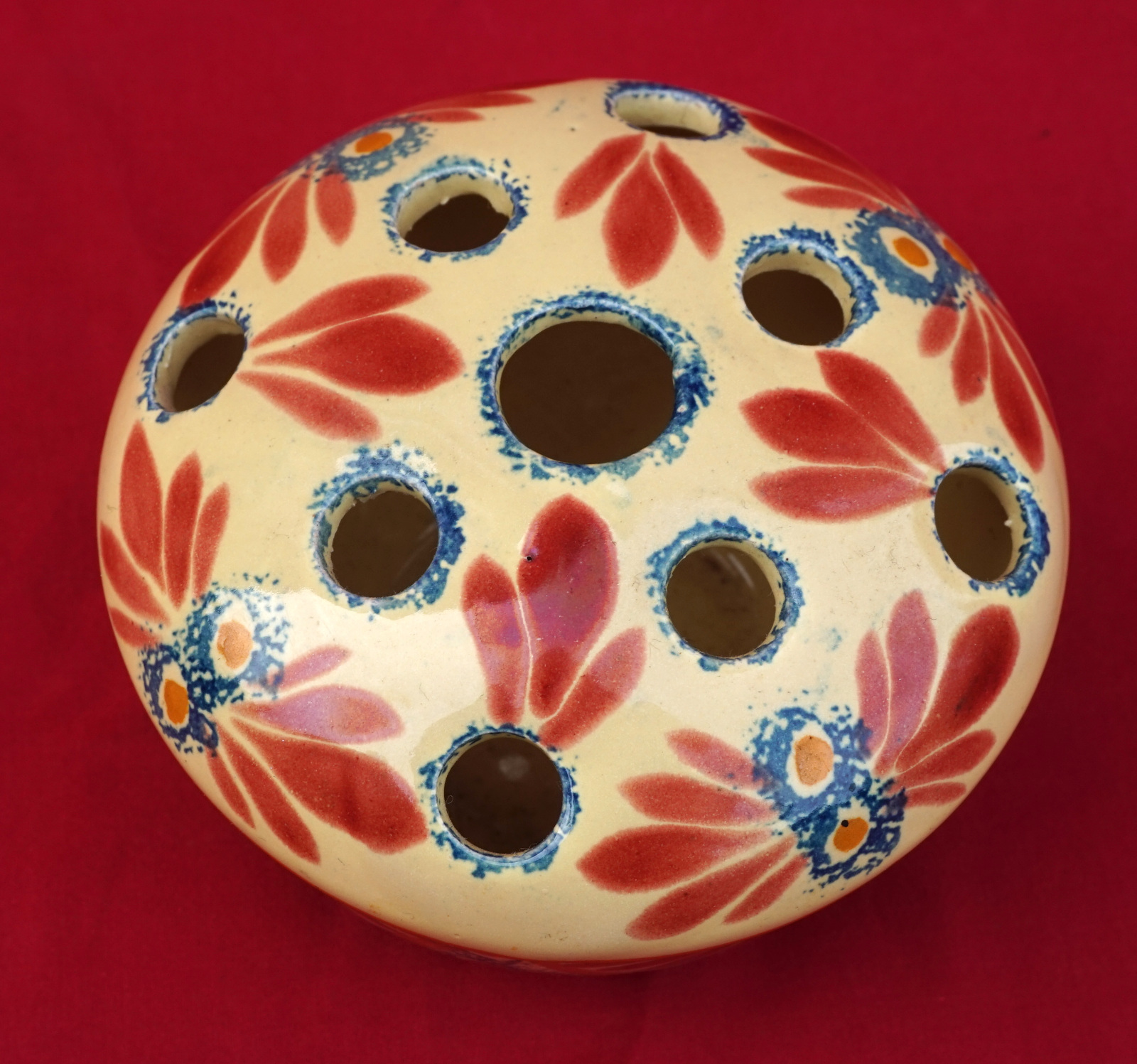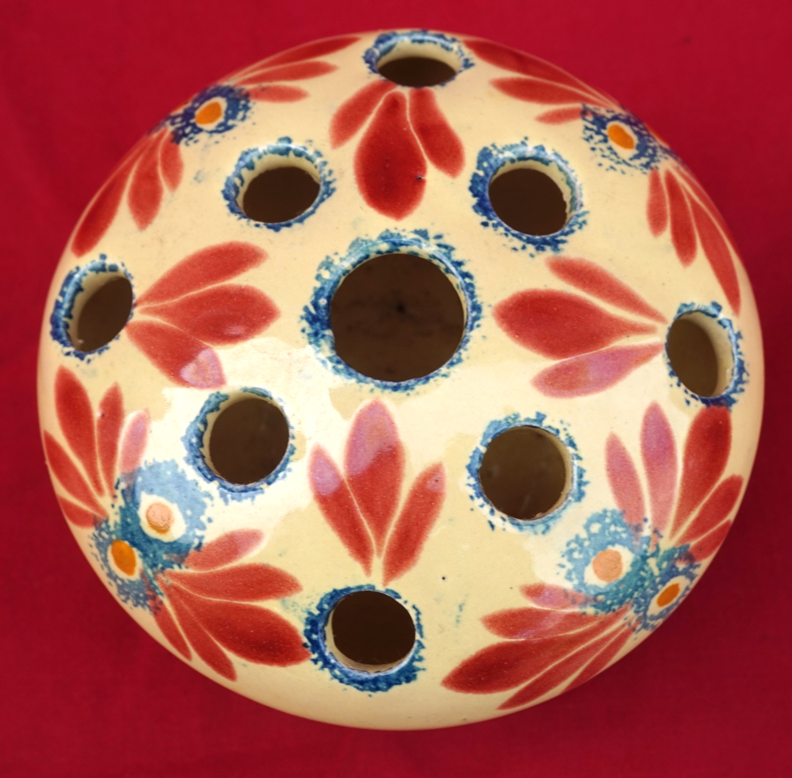 French hand painted faience flower frog top ball vase made by Henriot Quimper during the 1940's. It's signed on the bottom. 4 1/4" (11cm) diameter, 2 3/4" (7cm) height. Perfect condition